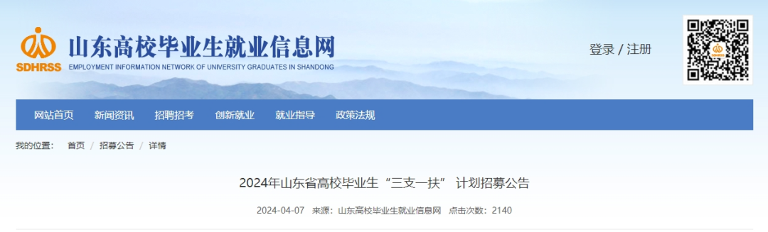 4月7日,2024年山东省高校毕业生“三支一扶” 计划招募公告发布。4月16日开始报名,5月18日笔试。