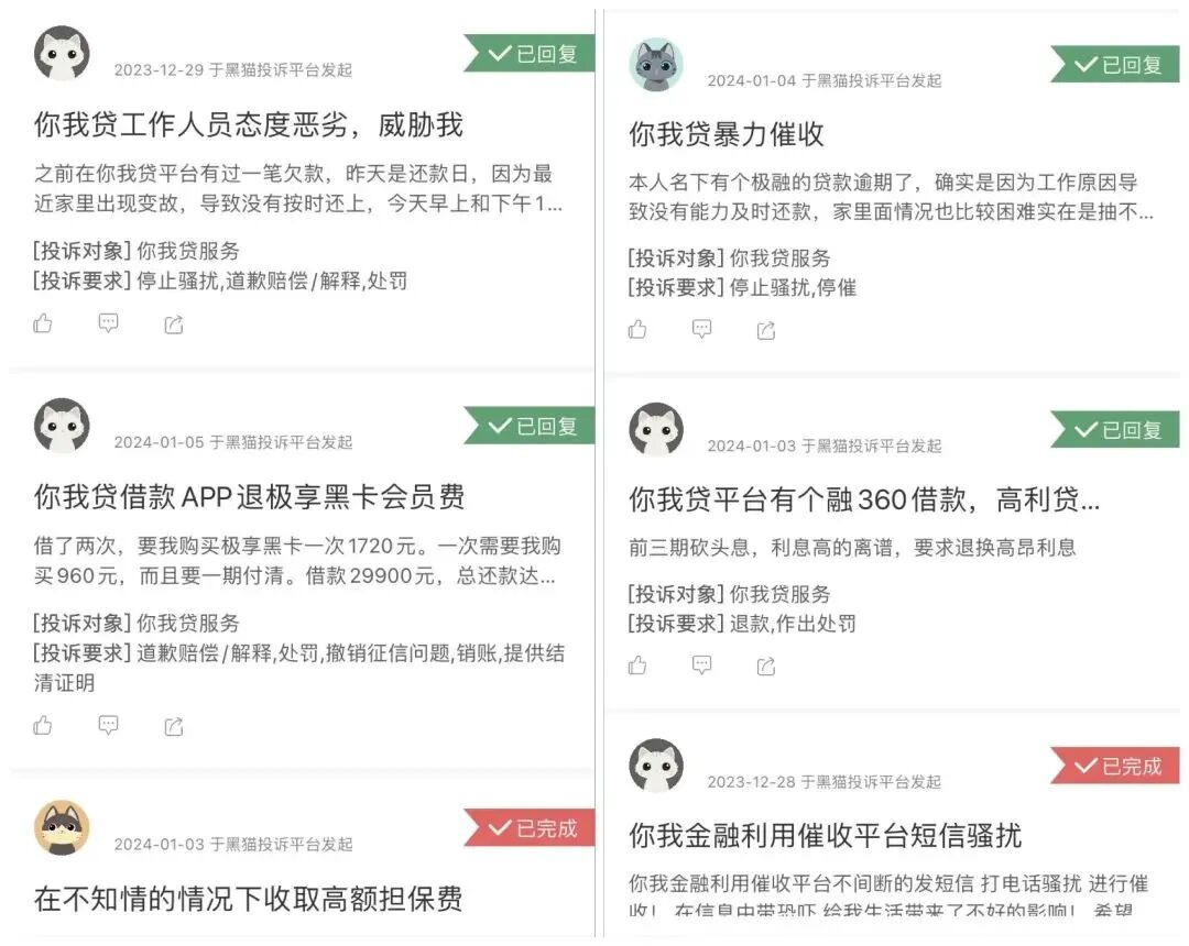 黑猫平台显示,截至4月7日,你我贷的累计投诉量超过6.8万条,较2022年末增长约1万条,变相高利贷问题尤为突出。