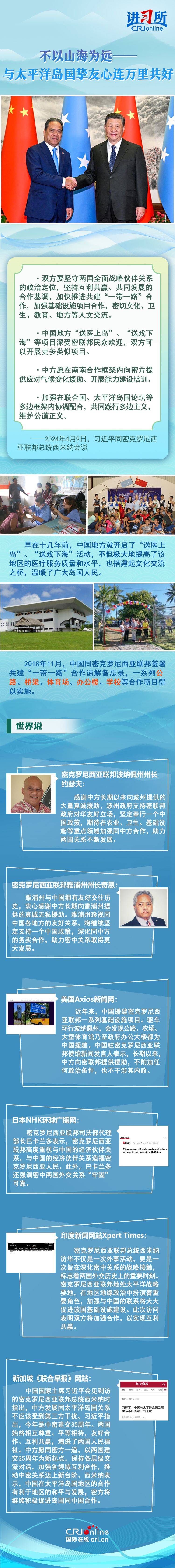 4月9日下午,中国国家主席习近平在北京同密克罗尼西亚联邦总统西米纳举行会谈时表示,每次见到太平洋岛国的朋友,都感到很亲切,中国地方“送医上岛”、“送戏下海”等项目深受密联邦民众欢迎,中方愿继续为岛国发展提供力所能及的支持,开展三方或多方合作。