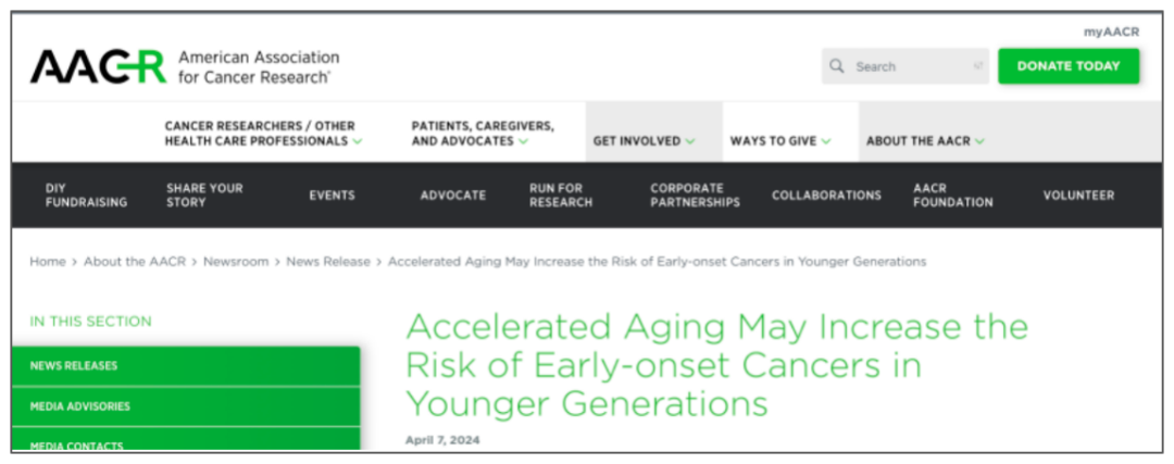 4月7日,2024年美国癌症研究协会(AACR)年会上发布了一项研究显示:年轻人或正在加速衰老,并且加速衰老与癌症风险增加有关。