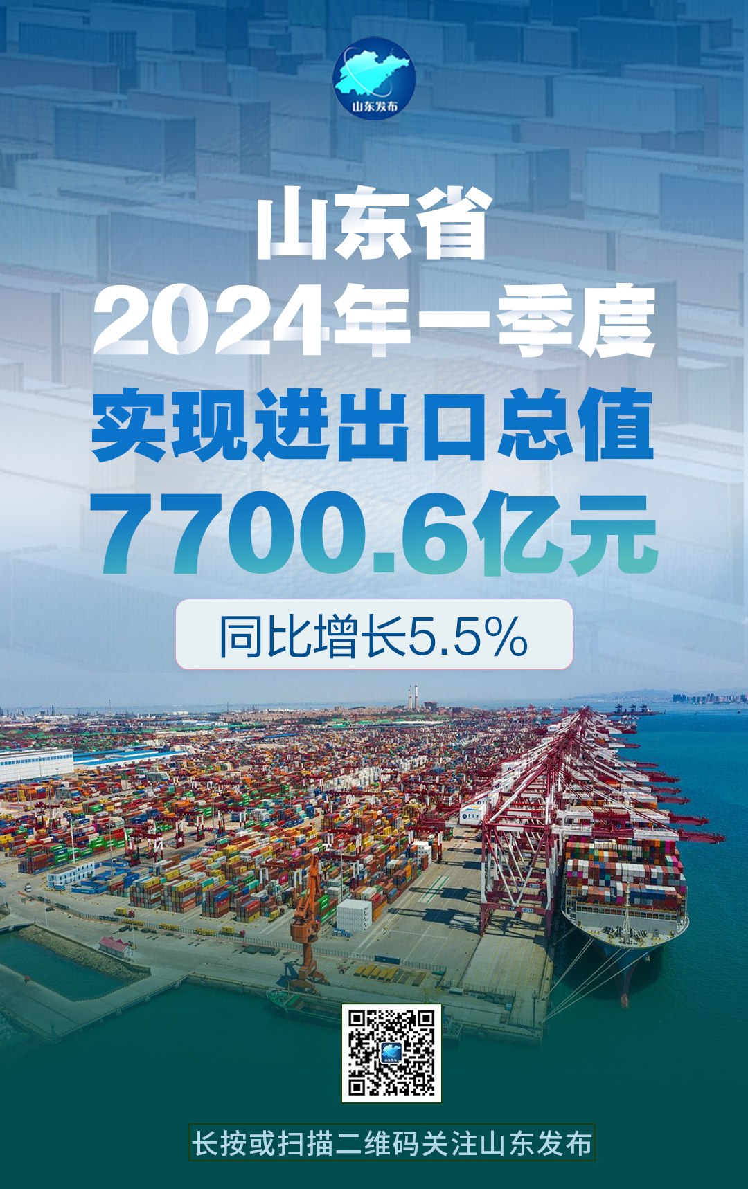 据海关统计,一季度山东进出口总值7700.6亿元,同比增长5.5%,高于全国5%的总体增速。其中,出口4706.2亿元,增长11%;进口2994.4亿元,下降2.1%。整体来看,一季度山东外贸进出口规模稳中有增、发展质量优中有升,基本盘不断巩固,新动能持续汇聚,开局有力、起势良好,为实现全年外贸“促稳提质”目标打下坚实基础。(山东省人民政府新闻办公室)