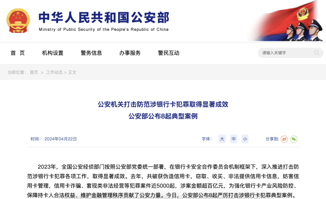 2023年,全国公安经侦部门共破获伪造信用卡,窃取、收买、非法提供信用卡信息,妨害信用卡管理,信用卡诈骗、套现类非法经营等犯罪案件近5000起,涉案金额超百亿元,为强化银行卡产业风险防控、保障持卡人合法权益、维护金融管理秩序贡献了公安力量。今日,公安部公布8起严厉打击涉银行卡犯罪典型案例。