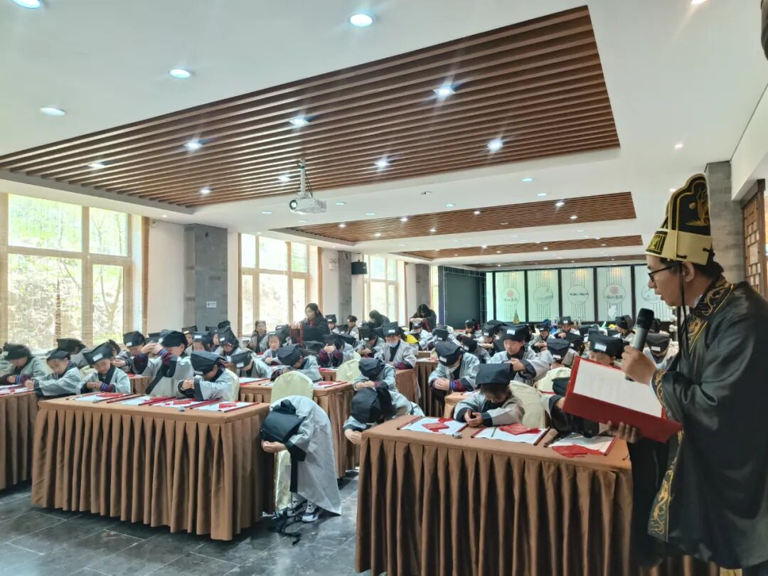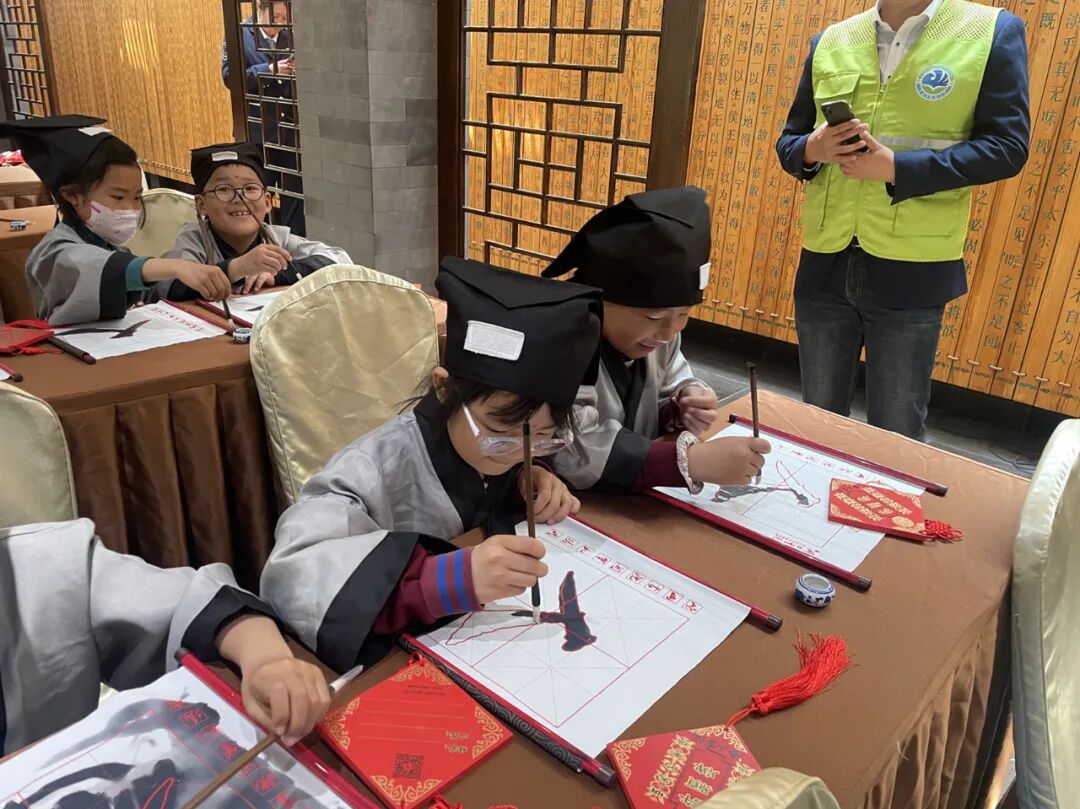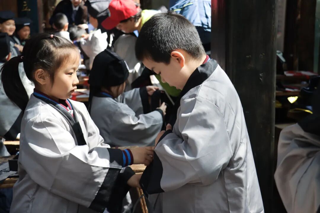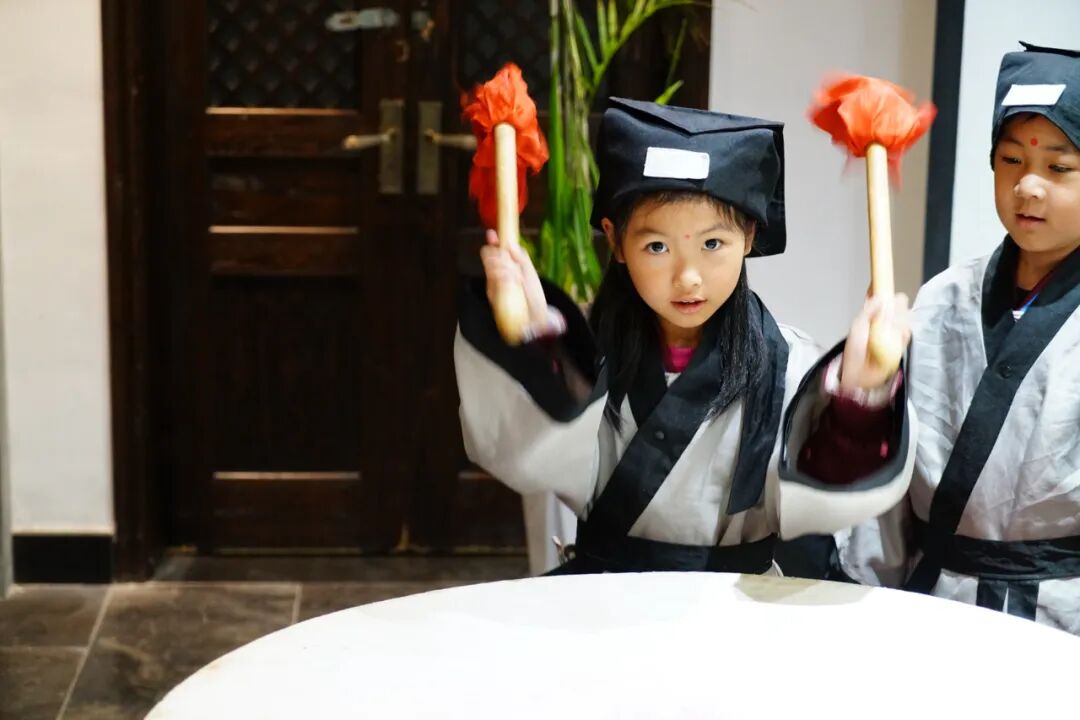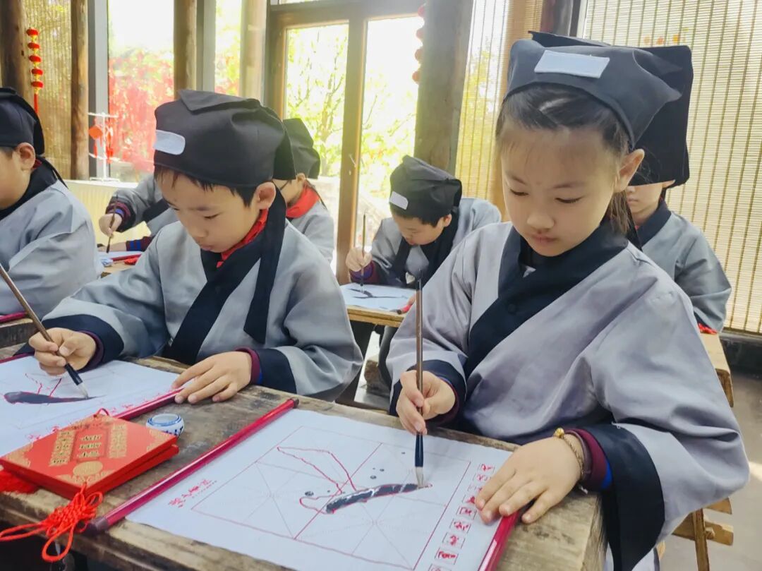 进入书院,古朴典雅的建筑迎面而来,学生首先来到静谧庄严的国学馆和民俗文化馆感受开笔礼,换上古代宽袍大袖的书童装,端坐在长案前,聆听书院老师讲解学堂文化,领略传统文化的博大精深。