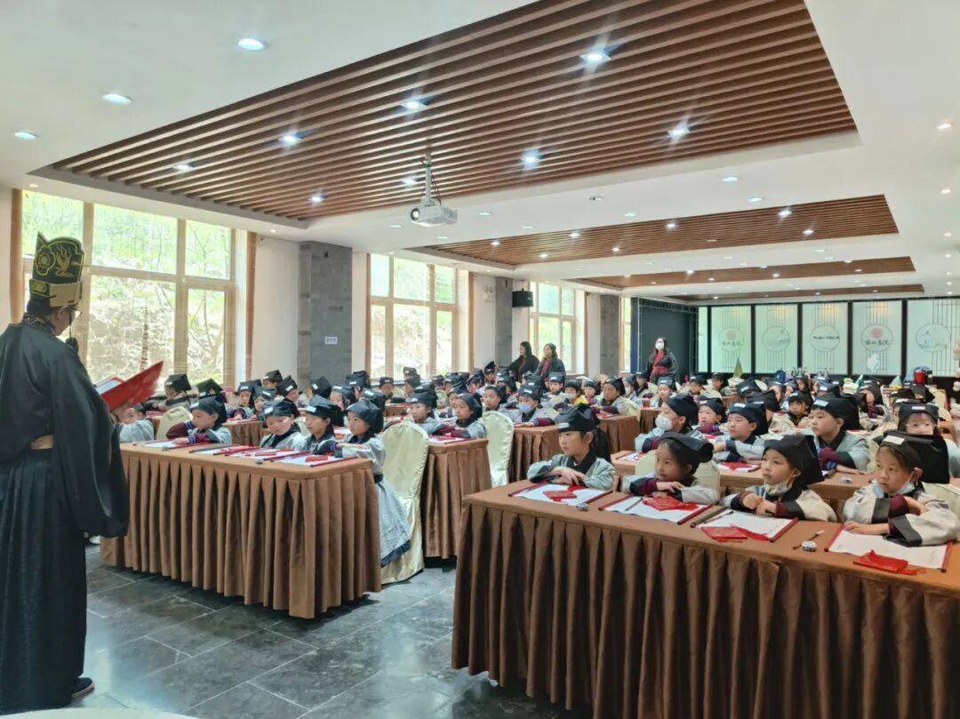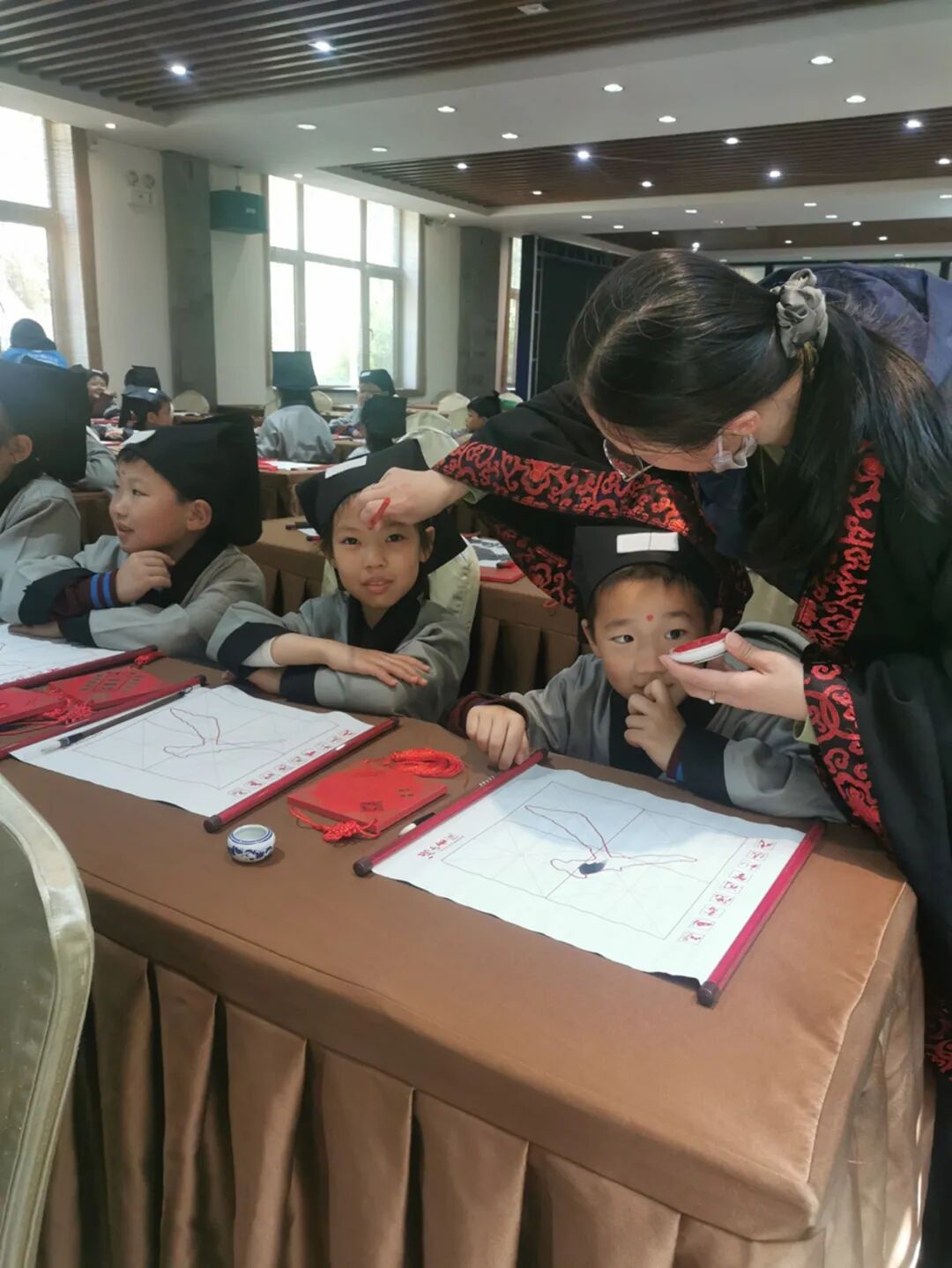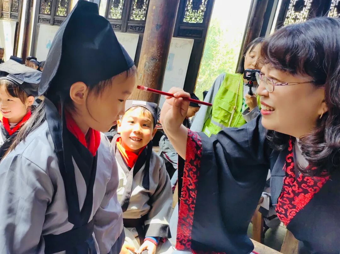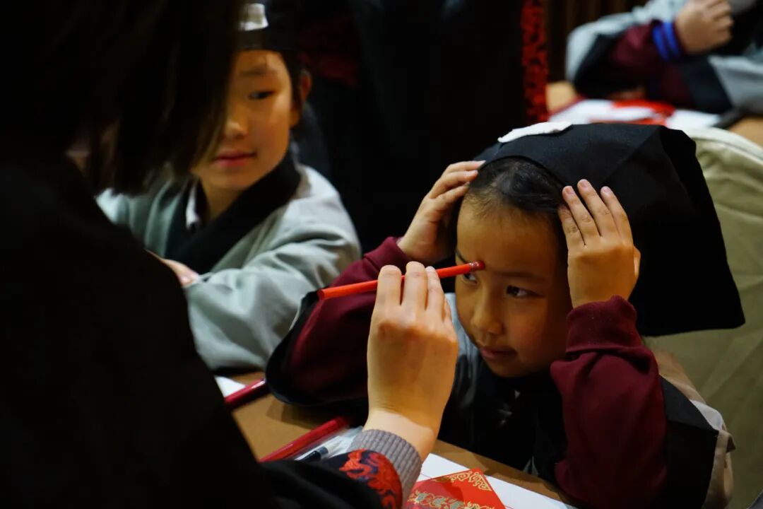 点朱砂,开天眼。老师用毛笔蘸取特制的朱砂液,在学子眉心中间轻轻点上一个像“痣”一样的小红点。痣与智同音,意为开启智慧。从此学生就开启智慧之门,在学习中眼明心亮,一点就通。