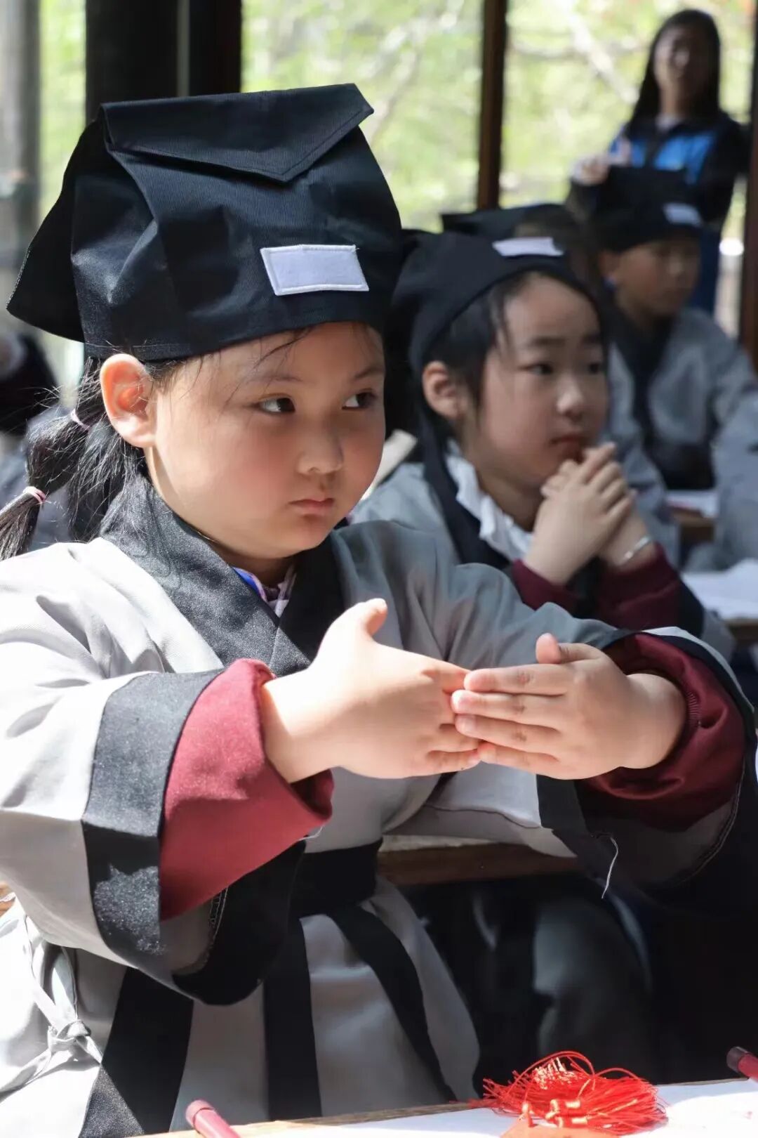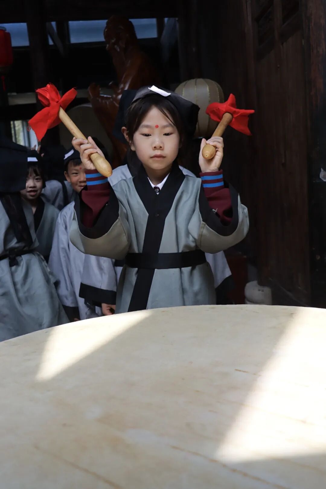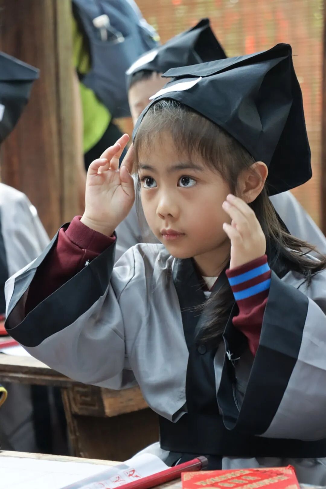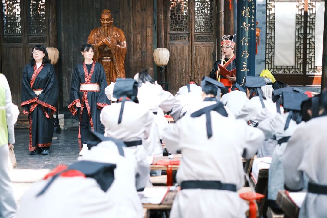点朱砂,开天眼。老师用毛笔蘸取特制的朱砂液,在学子眉心中间轻轻点上一个像“痣”一样的小红点。痣与智同音,意为开启智慧。从此学生就开启智慧之门,在学习中眼明心亮,一点就通。