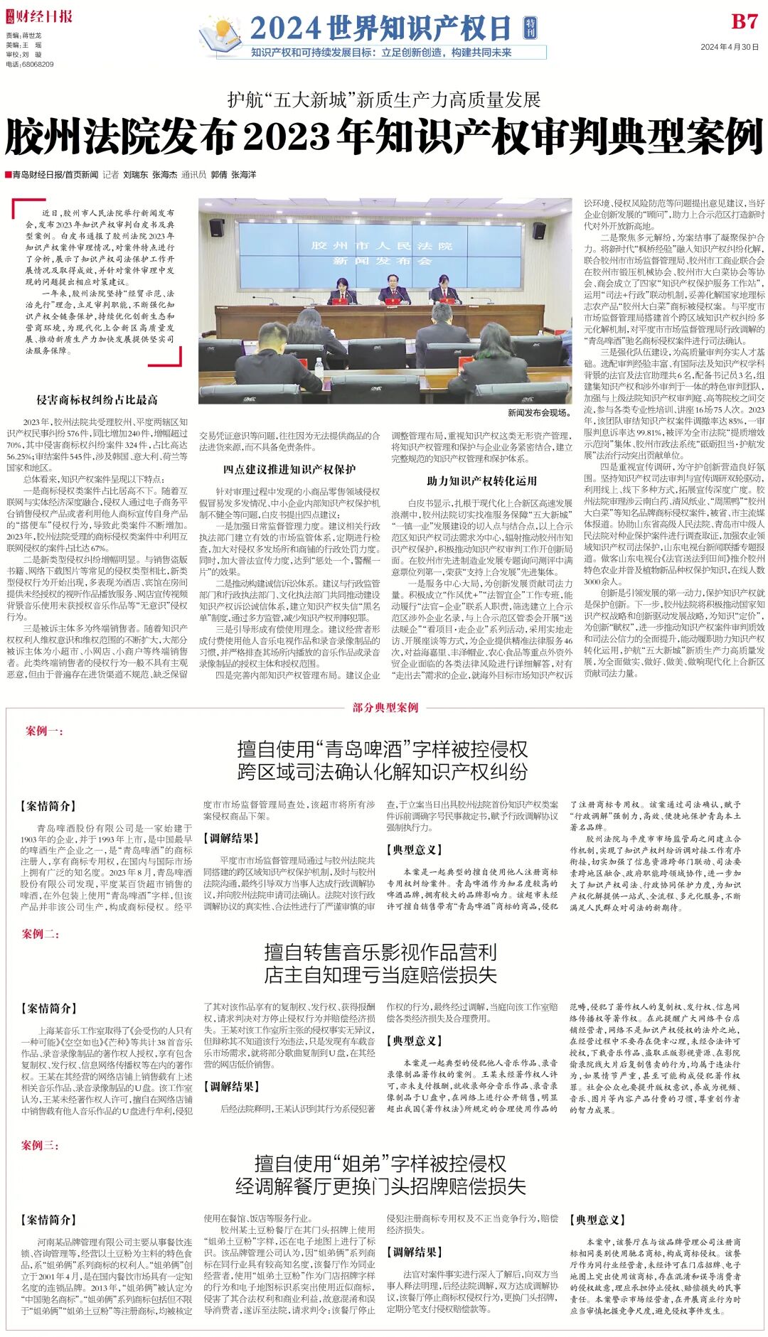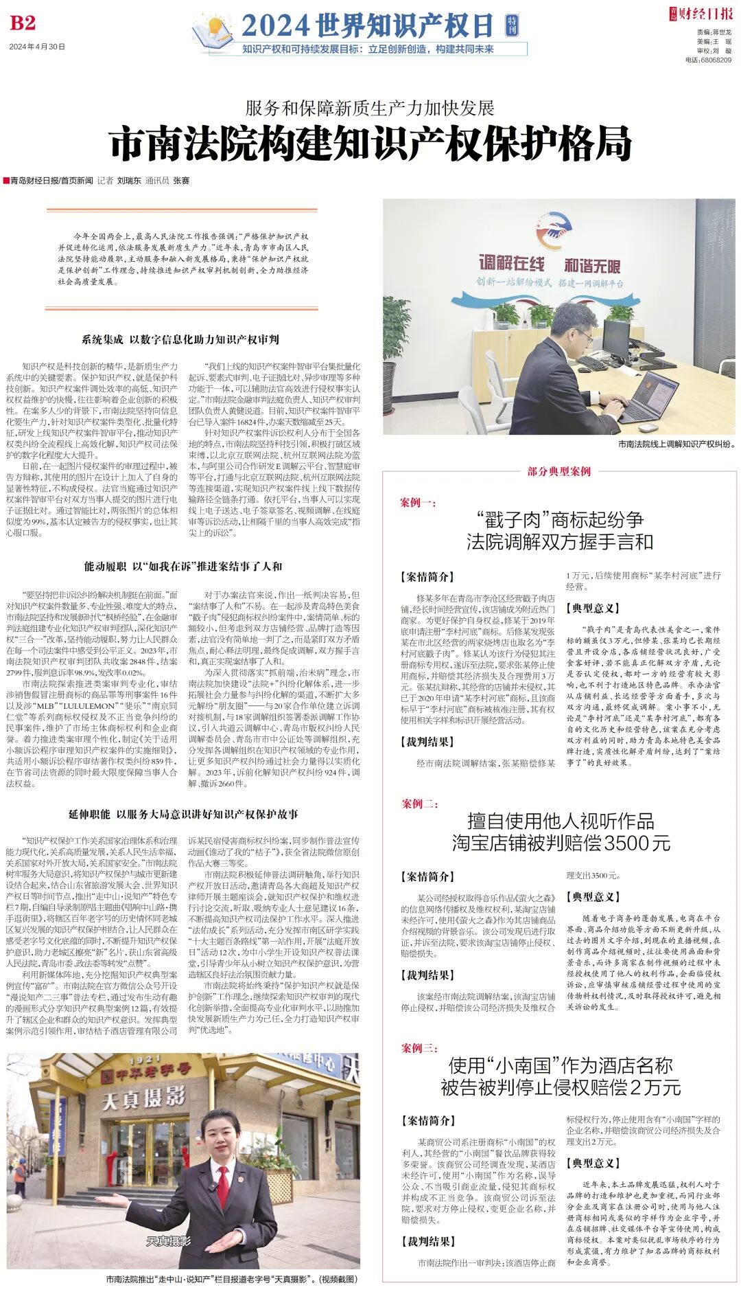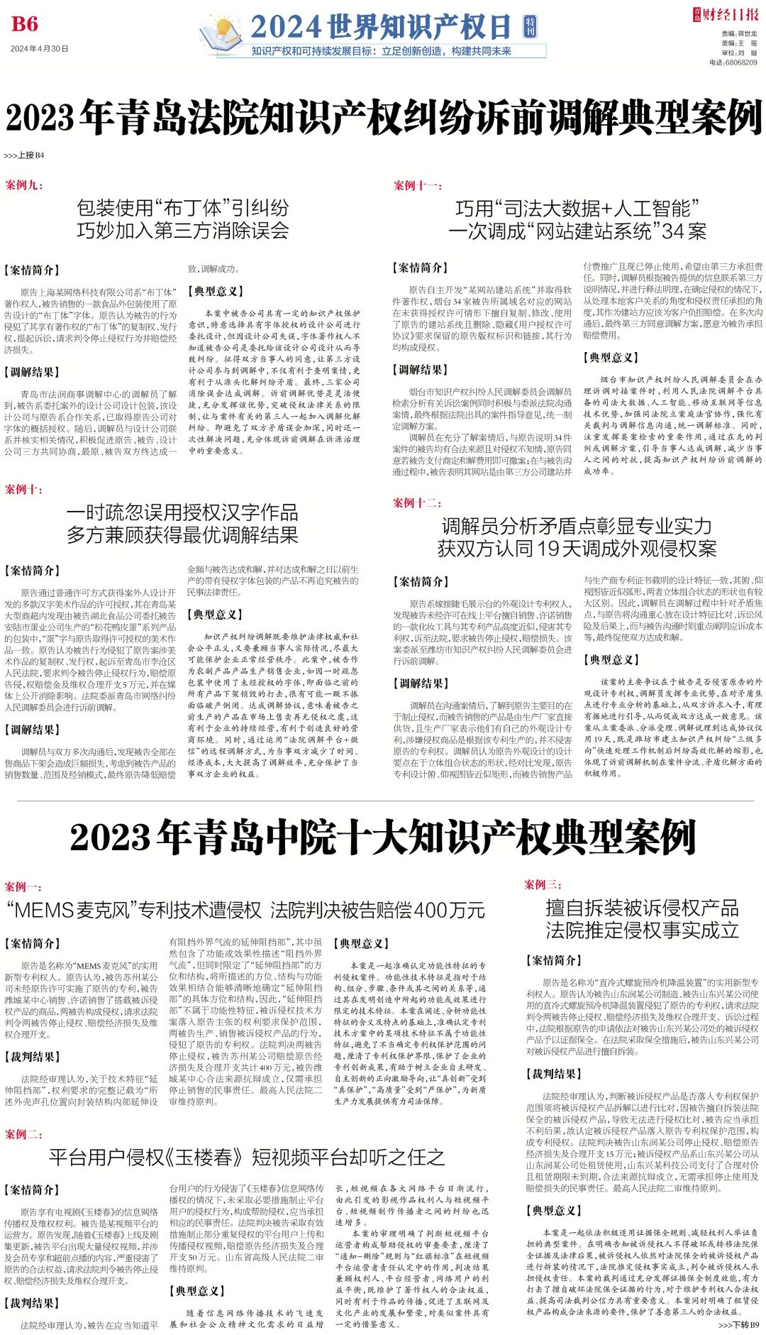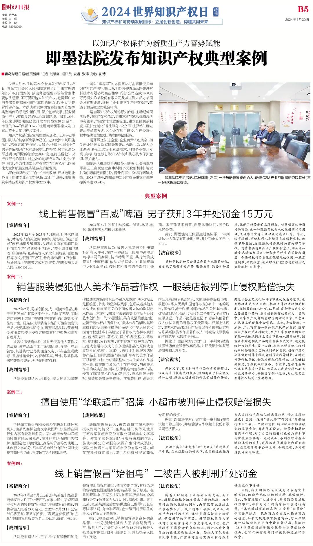 据悉,青岛财经日报与青岛中院自2006年起已连续19年在每年的4月26日前后推出《世界知识产权日特刊》,营造全社会支持创新创造尊重知识产权的良好氛围。