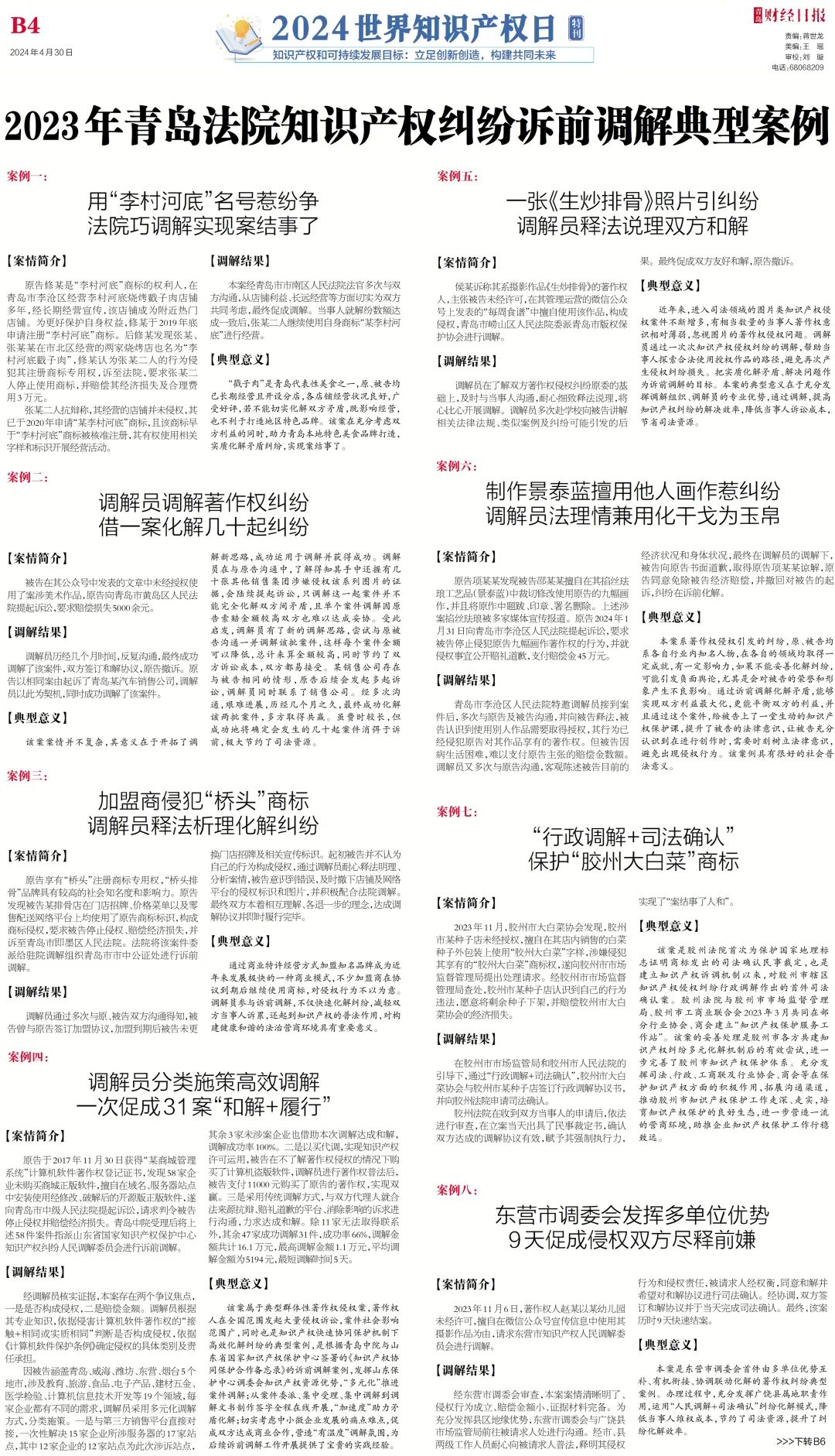 2023年,青岛两级法院通过调解平台累计委派知识产权案件5835件,同比增长47.3%,诉前调解成功率48.5%,较上年同期增长11.4%,平均调解时间14.41天,不断降低当事人的维权成本、减轻诉累,知识产权纠纷诉前调解工作实现新发展。