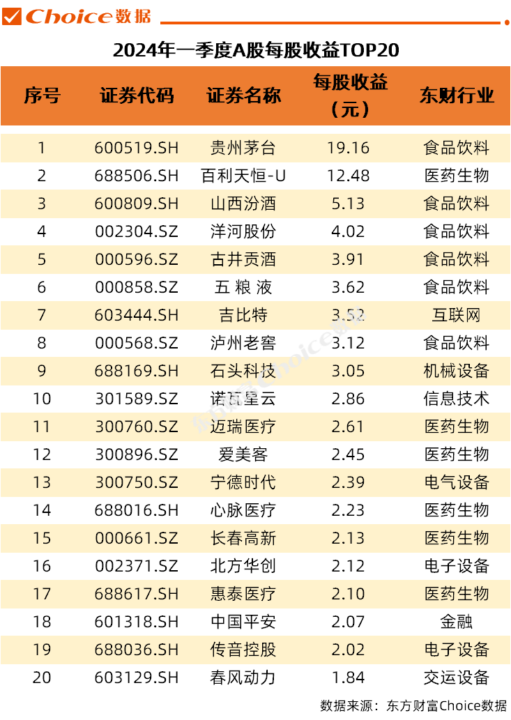 每股收益方面,2024年一季度排名第一的是贵州茅台,基本每股收益为19.16元,百利天恒-U、山西汾酒、洋河股份排名第二、第三、第四。