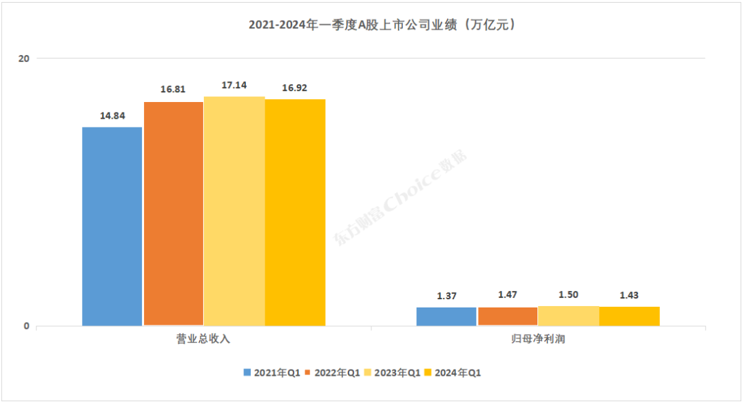 总体来看,2024年一季度所有已披露财报的A股上市公司合计实现营业总收入16.92万亿元,同比下降1.15%;合计归属母公司股东净利润1.43万亿元,同比下降4.29%。
