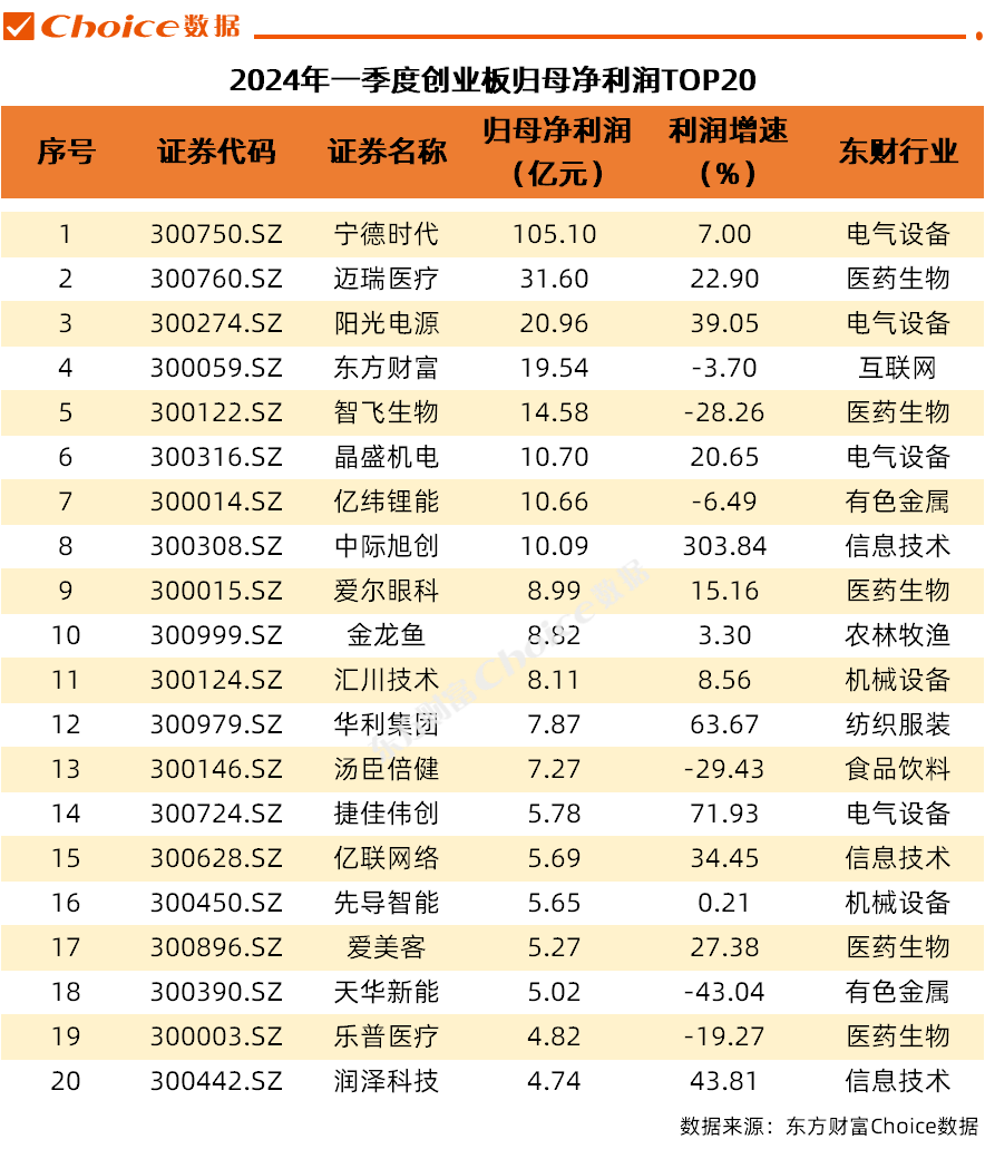 创业板方面,宁德时代以105.10亿元的净利润位居创业板2024年一季度“盈利王”,迈瑞医疗、阳光电源位居第二、第三。