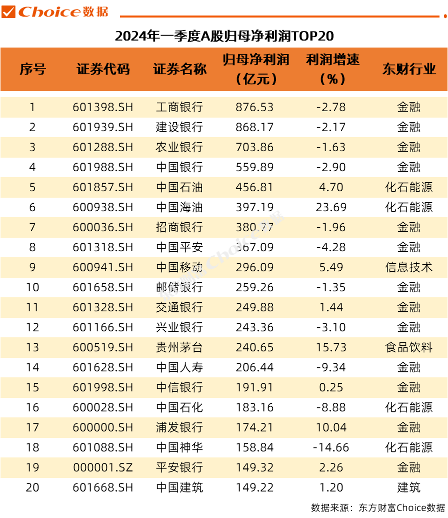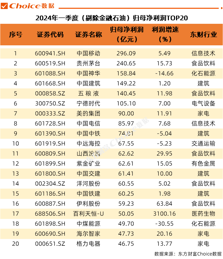 剔除金融石油,中国移动、贵州茅台、中国神华、中国建筑、五粮液排名2024年一季度利润榜前五。