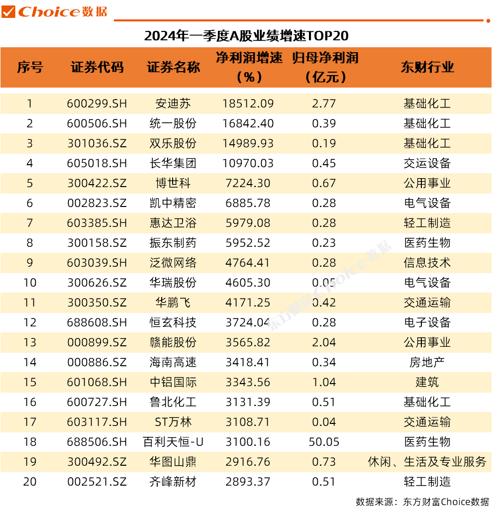 2024年一季度,8家公司净利润增速超过50倍,业绩增速最快的是安迪苏,达到18512.09%;统一股份、双乐股份、长华集团业绩增速均超过100倍。