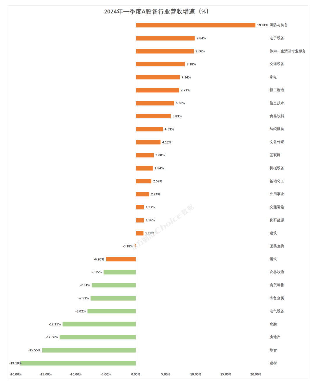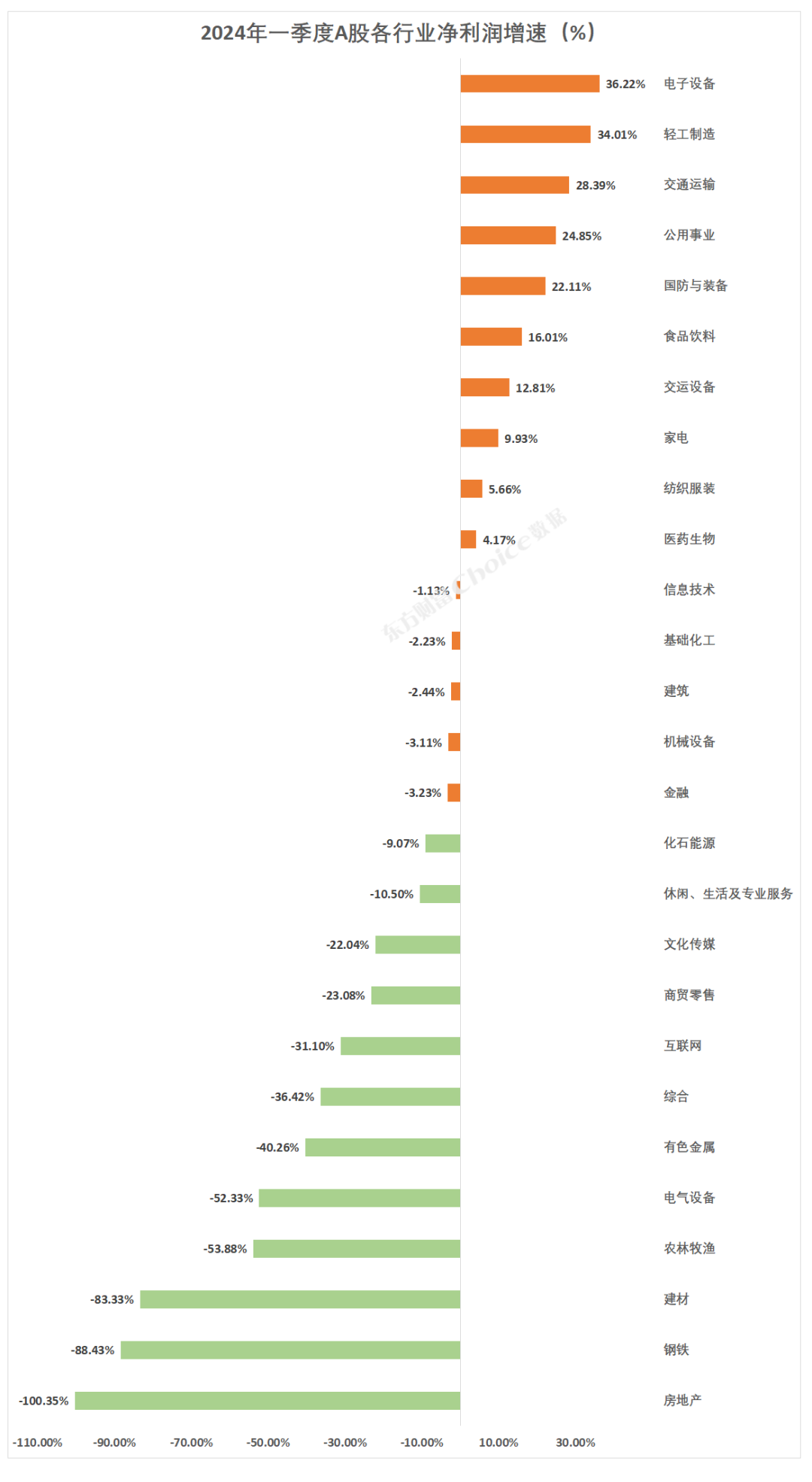 净利润增速方面,电子设备行业净利润增速最快,达36.22%,轻工制造、交通运输行业分别增长34.01%、28.39%。房地产行业净利润增速同比下降超100%。