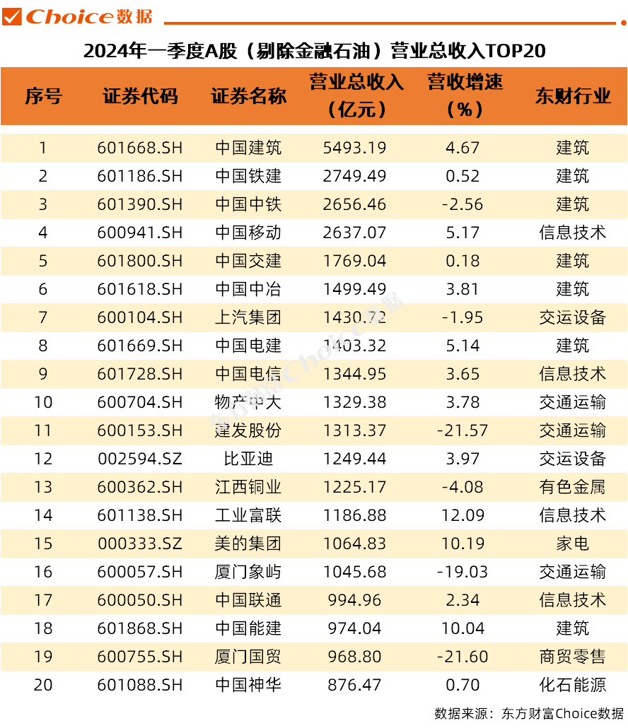 2024年一季度,中国石油以营业总收入8121.84亿元位列第一,中国石化、中国建筑营业总收入均在5000亿元以上。