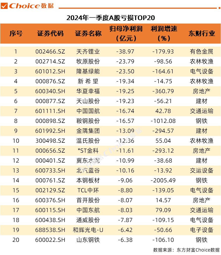 2024年一季度,13家上市公司归母净利润亏损超过10亿元。