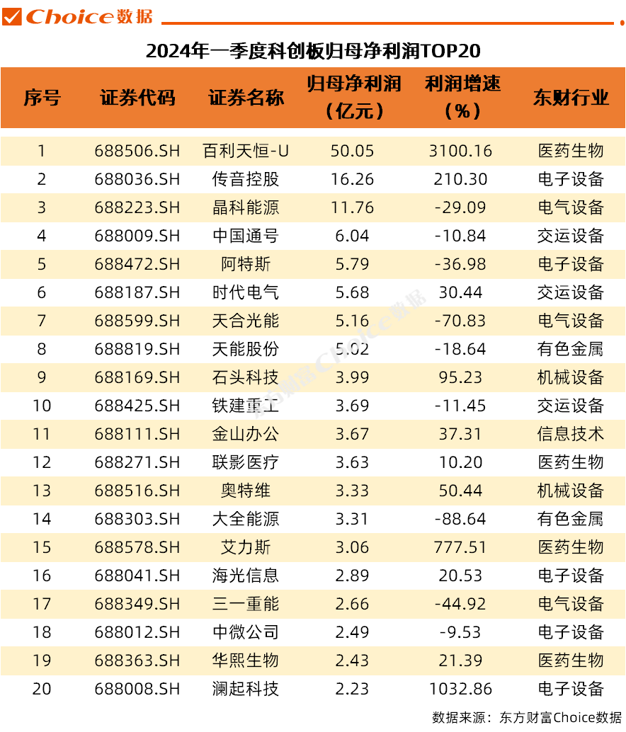 科创板“盈利王”是百利天恒-U,净利润达到50.05亿元,传音控股、晶科能源位居第二、第三。