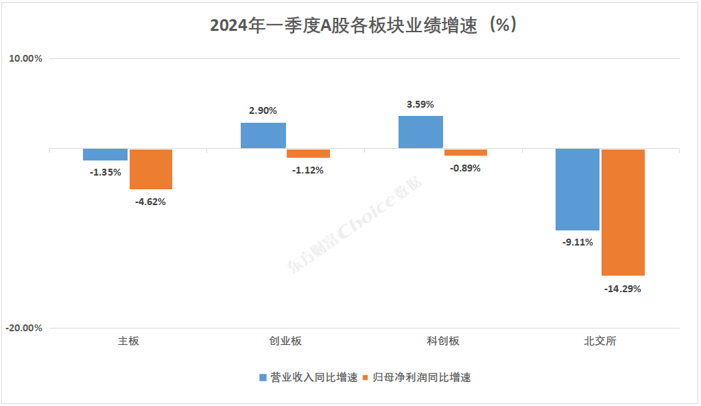 分板块来看,主板、创业板、科创板、北交所2024年一季度分别实现营业收入15.67万亿元、0.87万亿元、0.28万亿元和0.04万亿元,较2023年一季度增长-1.35%、2.90%、3.59%和-9.11%;分别实现净利润1.36万亿元、592.31亿元、172.12亿元和24.49亿元,同比下降4.62%、1.12%、0.89%和14.29%。
