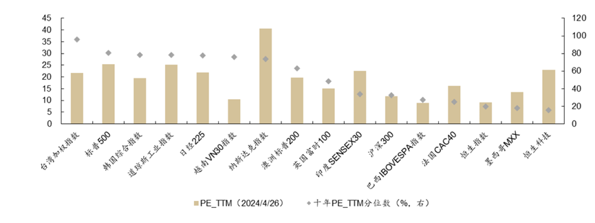 全球主要市场市盈率水平对比 来源:Wind 截至2024年4月26日