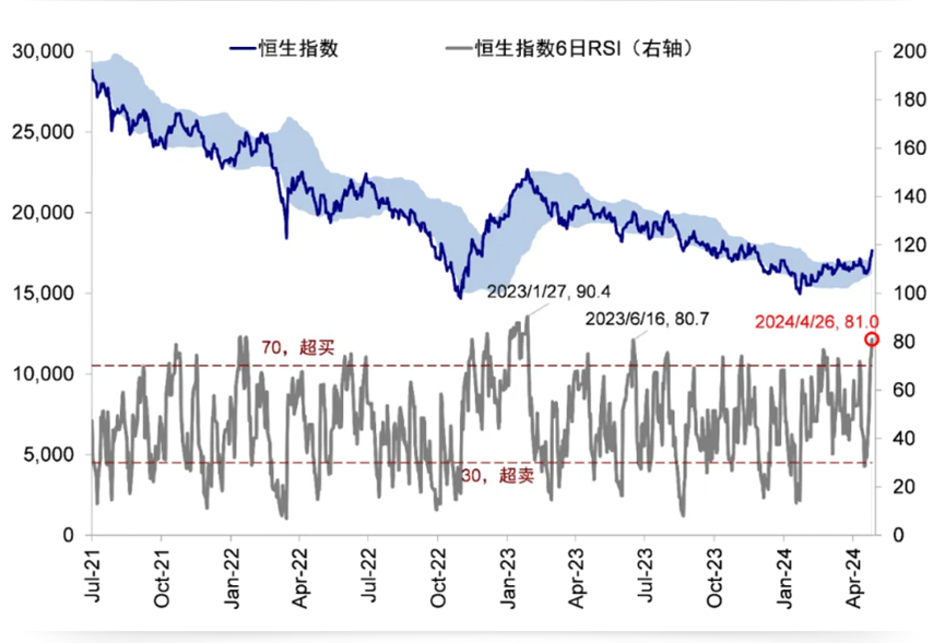 至于短期,需要注意超买压力。Wind数据显示,当前恒生指数超买程度已创2023年1月以来新高。恒生指数在19000点区域面临月线长期下降通道压力。