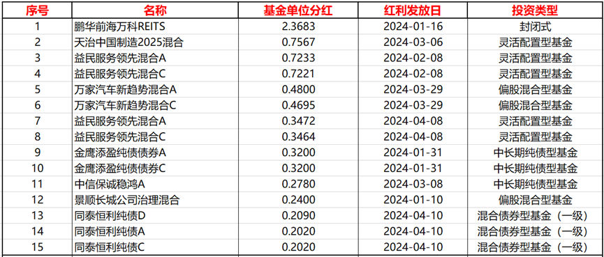 从单位份额分红金额看,分红最丰厚的前五只基金(不同份额合并计算)分别是鹏华前海万科REITs、天治中国制造2025、益民服务领先、万家汽车新趋势、金鹰添盈纯债。其中,益民服务领先年内两次分红,如果看单位份额累计分红,益民服务领先超过天治中国制造2025位居第二位。