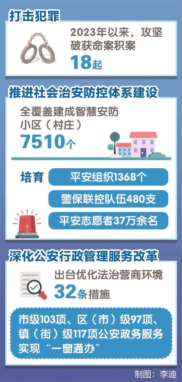一是坚持系统观念,完善防控布局。构建“市周界、主城区、核心区”三道数字防控圈层,拓展机场、地铁、港航安保体系,织牢织密海岸防控链条,全覆盖建成智慧安防小区(村庄)7510个。