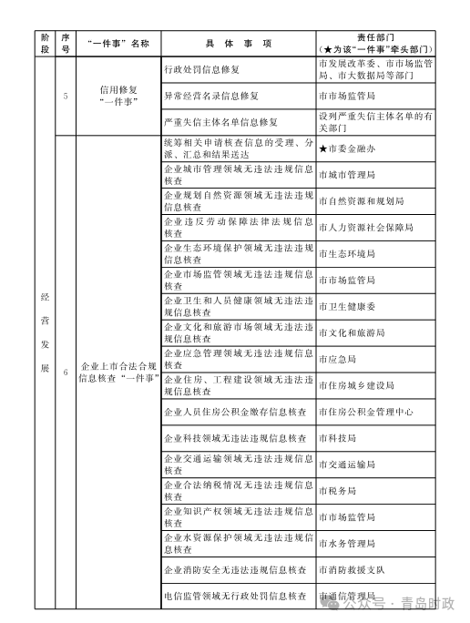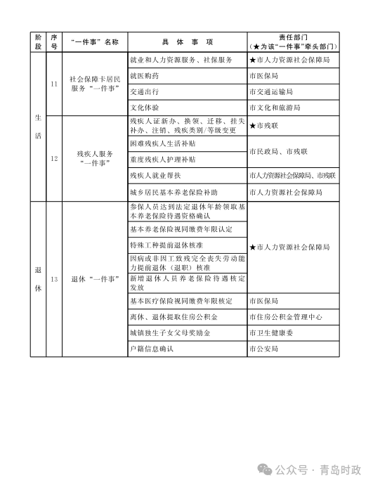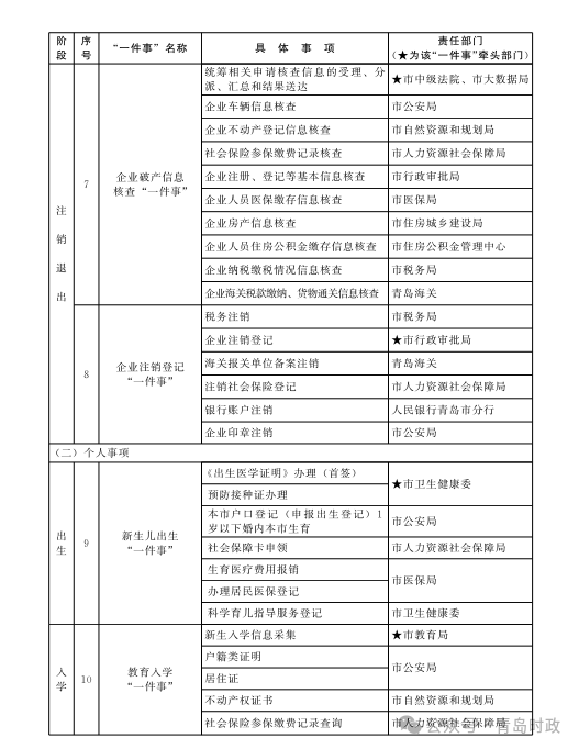 (二)深化政务服务模式创新。推进关联事项集成办,全面落实国务院首批“高效办成一件事”重点事项,高质量完成企业注销登记、教育入学、残疾人服务3个国家确定创新示范“一件事”,逐个建立“一个牵头部门、一个工作团队、一套工作方案”运行机制。(责任单位:市委金融办、市中级法院、市发展改革委、市教育局、市人力资源社会保障局、市交通运输局、市卫生健康委、市大数据局、市行政审批局、市残联)鼓励各区(市)各部门从实际出发改革创新、大胆探索,不断拓展新的服务场景,推出具有青岛特色的“一件事”。推进容缺事项承诺办,以政务服务部门清楚告知、企业和群众诚信守诺为基础,对风险可控、纠错成本低且能够通过事中事后监管有效防范风险的政务服务事项,推行“告知承诺+容缺办理”审批服务模式。(责任单位:各政务服务部门)持续落实政务服务事项省内通办、跨省通办,依托线下代收代办服务模式,按需开设远程虚拟窗口,做到就近办、异地办。(责任单位:市行政审批局、市大数据局)