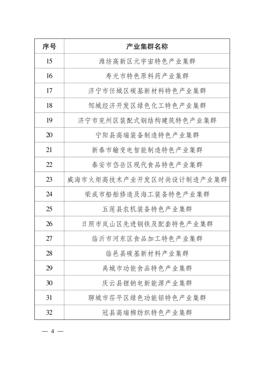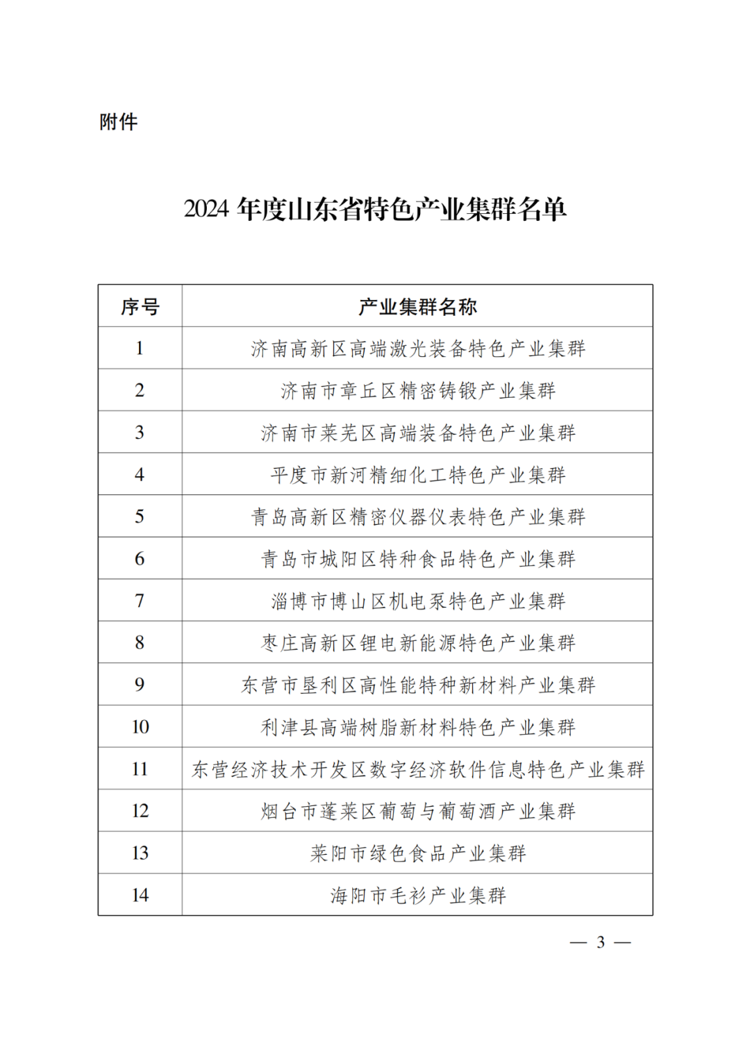 根据《促进中小企业特色产业集群发展暂行办法》(工信部企业〔2022〕119号)和《山东省特色产业集群管理办法》(鲁工信发〔2020〕5号),省工业和信息化厅组织开展了2024年度山东省特色产业集群培育认定工作。经集群自愿申报、各市推荐、专家评审和网上公示等程序,确定济南高新区高端激光装备特色产业集群等36家集群为2024年度山东省特色产业集群,现将名单予以公布。