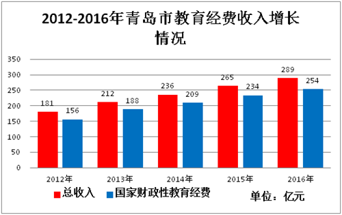 2016年青岛市教育经费总收入达到289亿元,比上年增加24亿元,增长9.1%,高于全国7%的平均增长率。其中,国家财政性教育经费为254亿元,比上年增加20亿元,增长8.5%。国家财政性教育经费占地区生产总值的比例达到2.54%,比上年提高0.02个百分点。2016年公共财政教育经费占公共财政预算支出的比例达到18.54%,在五个计划单列市排第一位。近年来,青岛市的教育经费投入水平连年提高,2012-2016年教育经费总投入达到1182亿元,是前五年的2.28倍,5年年均增长率为15%。