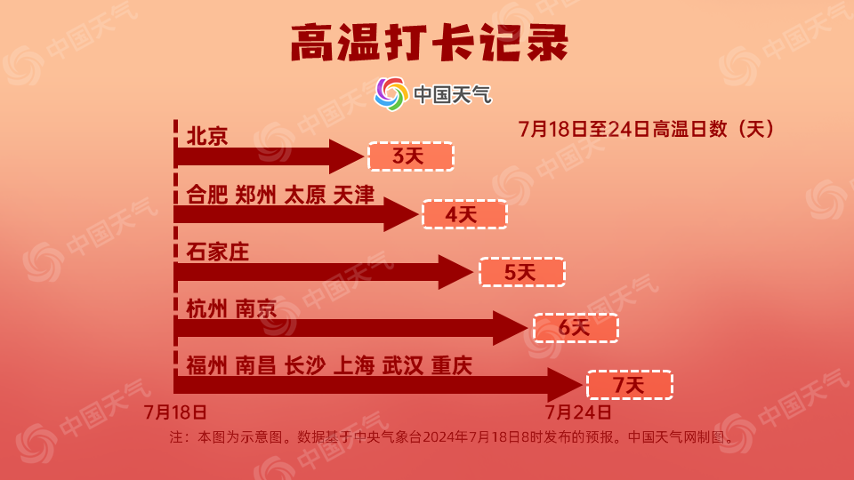 从中国天气网推出的大城市高温日历来看,18日至24日,福州、南昌、长沙、上海、武汉、重庆高温将全勤打卡,其中福州或连续4天最高气温达40℃,杭州也将连续6天出现38℃至40℃的酷热天气。上述地区不仅气温高,空气湿度也较大,户外犹如桑拿房,“焖蒸感”十足。
