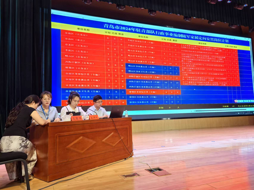 青岛市2024年驻青部队行政事业编制随军家属定向安置公开选岗会近日举行,90余名符合条件的行政事业编制随军家属根据编制性质、岗位类别、积分排序进行了公开选岗,青岛市退役军人事务局、青岛市人大代表、青岛市政协委员、青岛市委编办、青岛市人力资源和社会保障局、青岛市纪检监察、青岛警备区等部门参与现场监督。