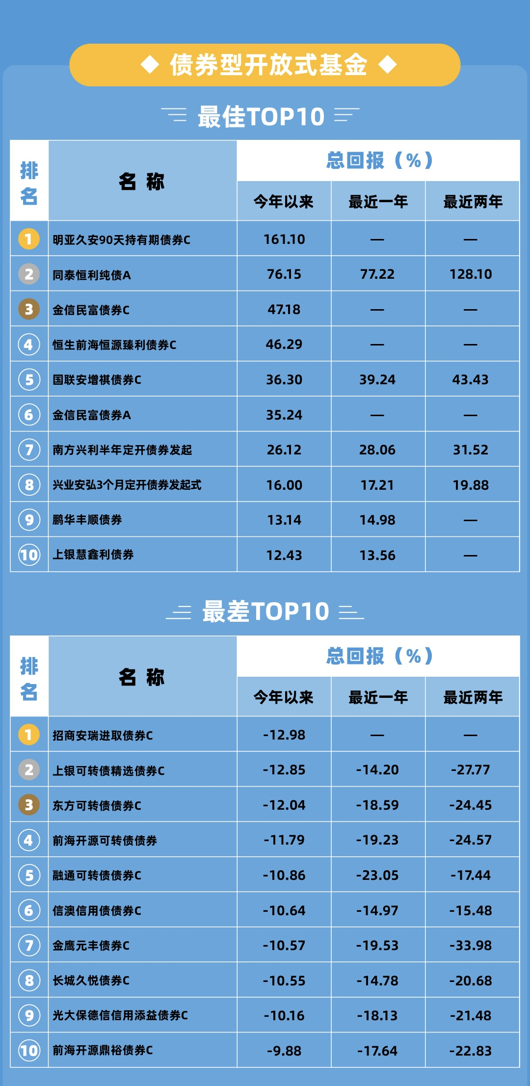 垫底榜上的债基,大部分是受到可转债的拖累。招商安瑞进取这样名字中带有“增强”“强化”“进取”等字眼的债基,都会重点配可转债以增强进攻性。信澳信用债、长城久悦等基金,虽然在基金名称中没有明示,但资产组合中有70%以上投向了可转债。可转债表现与正股同步,因为股市整体表现不佳,可转债会受到正股下跌影响,这是把双刃剑,一不小心就会割伤自己。