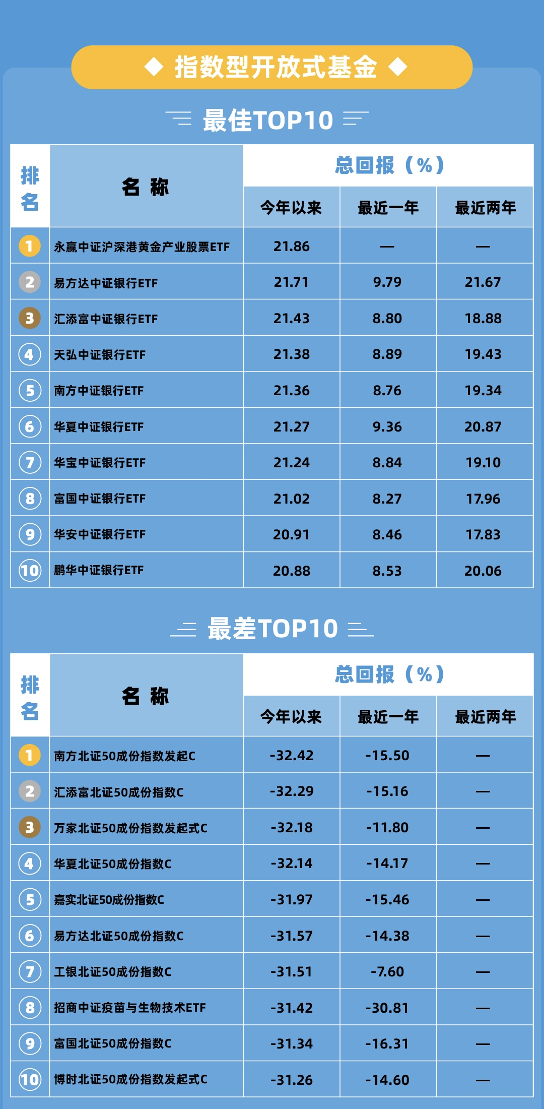 红利资产在7月由强转弱,对指数基金榜单排名影响明显,6月领跑的多只重仓中字头股票的国企共赢ETF本月排名跌出前50,7月TOP10除了永赢黄金产业股票ETF是上月榜单的老面孔,其余九只全部更换为跟踪中证银行指数的ETF。