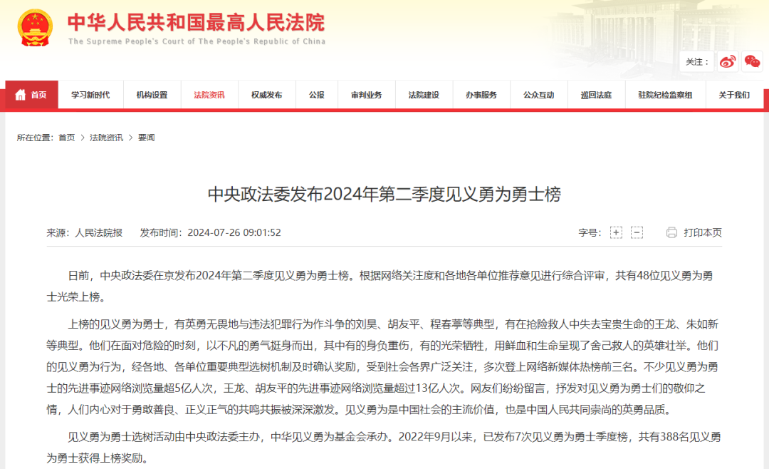 2024年第二季度见义勇为勇士榜,山东的王龙、吴青、卞秀芹上榜。