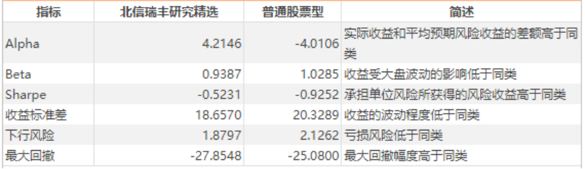 不过即使是出现亏损,北信瑞丰研究精选的阿尔法和贝塔指标仍然好于同类基金,表明基金经理具备一定的主动管理能力。