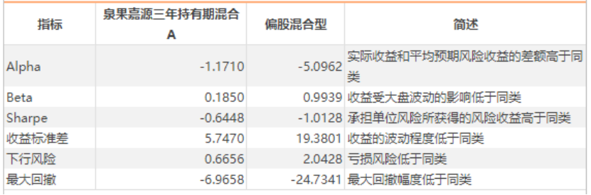 该基金阿尔法、贝塔、夏普等指标,均明显好于同类型基金,也就是说同样承担一个单位的风险,该基金盈利明显高于同类平均水平,而且收益受到大盘影响较小。