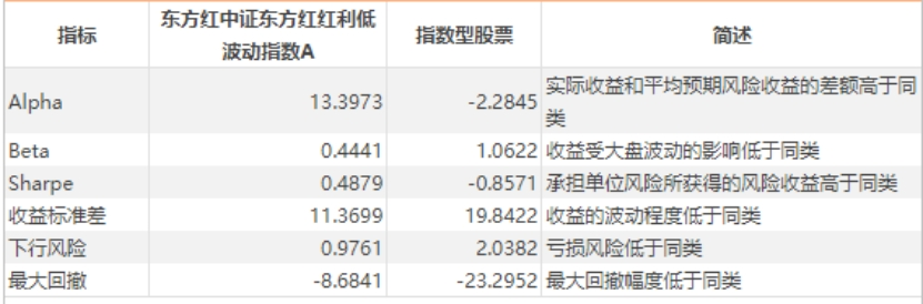 该基金风险收益指标表现出色,尤其是代表超额收益能力的阿尔法指标超过13,通俗说就是市场整体表现不好的时候,这只基金往往表现得非常好。这是因为当市场风险上升时,大量资金涌入红利资产避险,由此推动红利指数上涨。