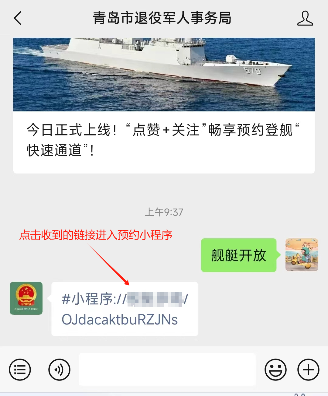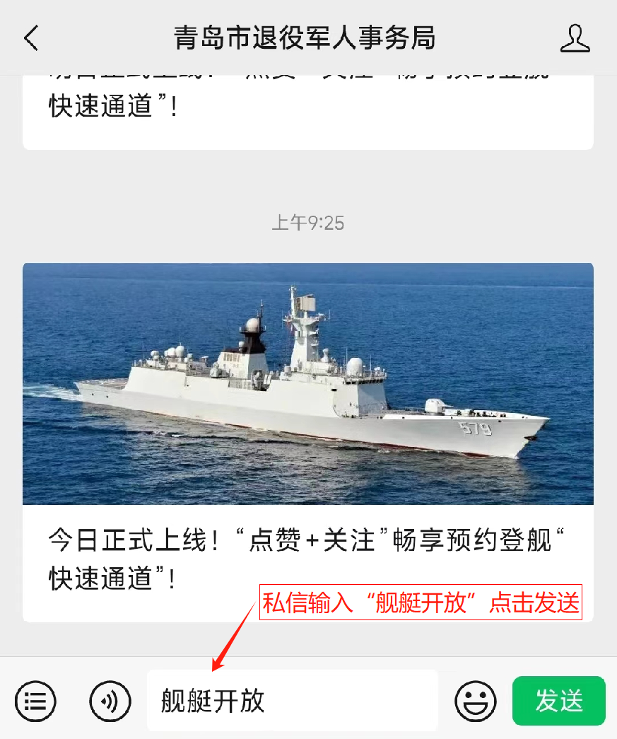 为了助您更快捷地预约,青岛市退役军人事务局微信公众号特别推出免费预约小程序助您“抢票”,关注“青岛市退役军人事务局”微信公众号,私信回复“舰艇开放”。