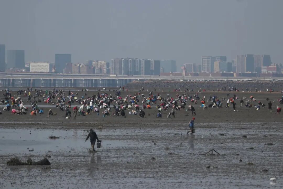 即使是青岛的“后海”,胶州湾,也涌入了大量的游客,他们带着小锄头、小铲子、桶或袋子,在这个秋季充分享受着挖蛤蜊的“获得感”: