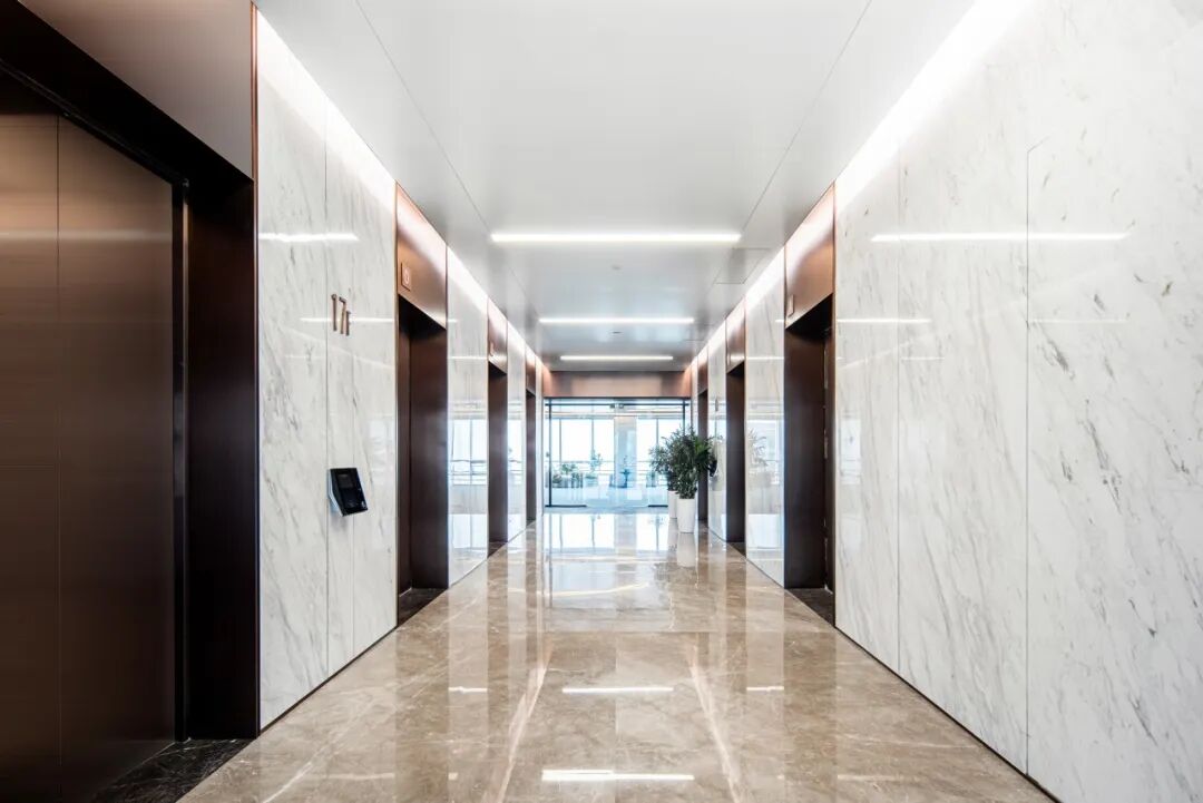 9部通力品牌电梯,五大部件原装进口,梯速约4m/s,还引入电梯目的层预选技术,智慧派梯,快速分流不同梯层候梯人群,非常优越的解决了商务办公的内部高效交通问题。
