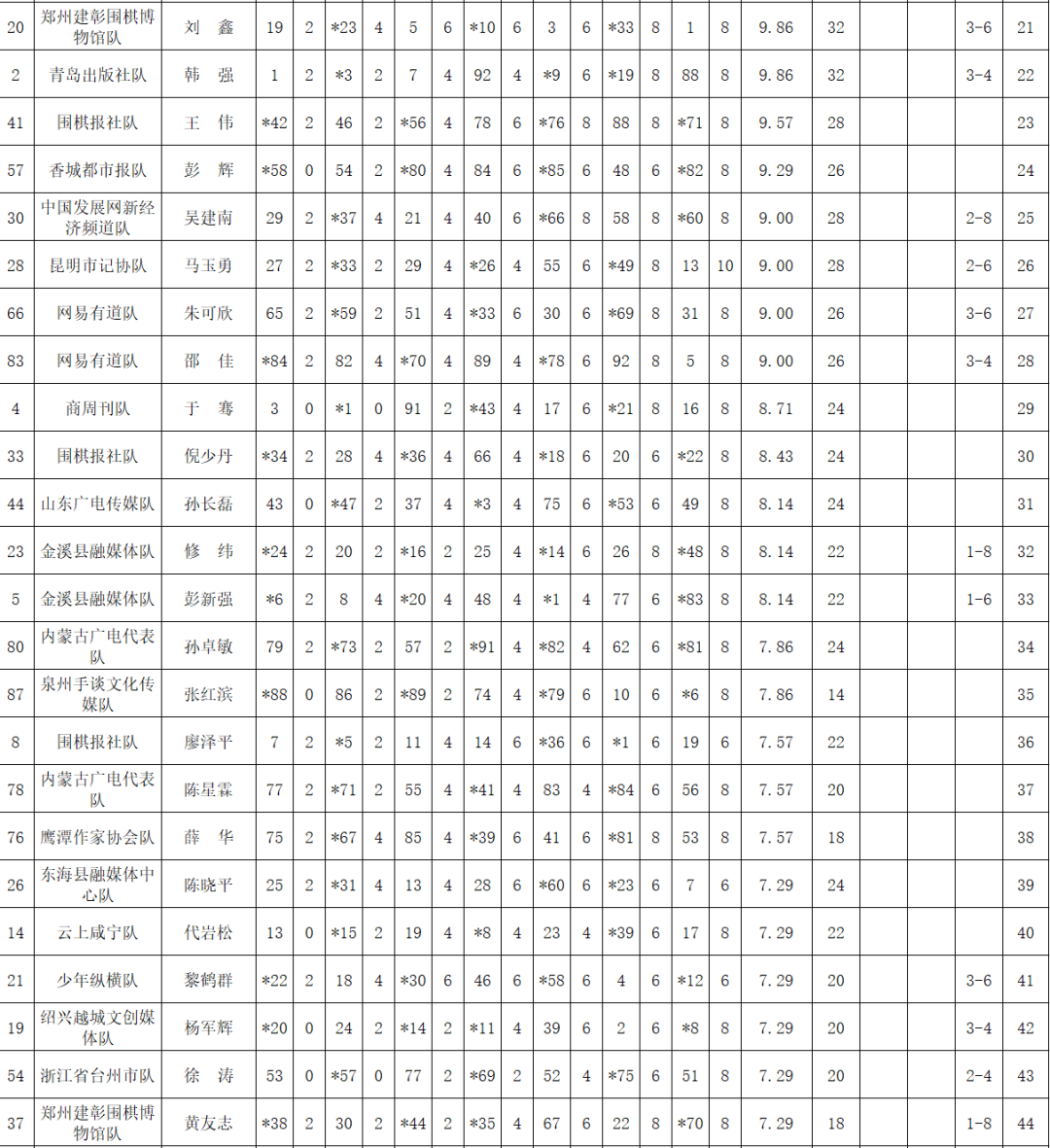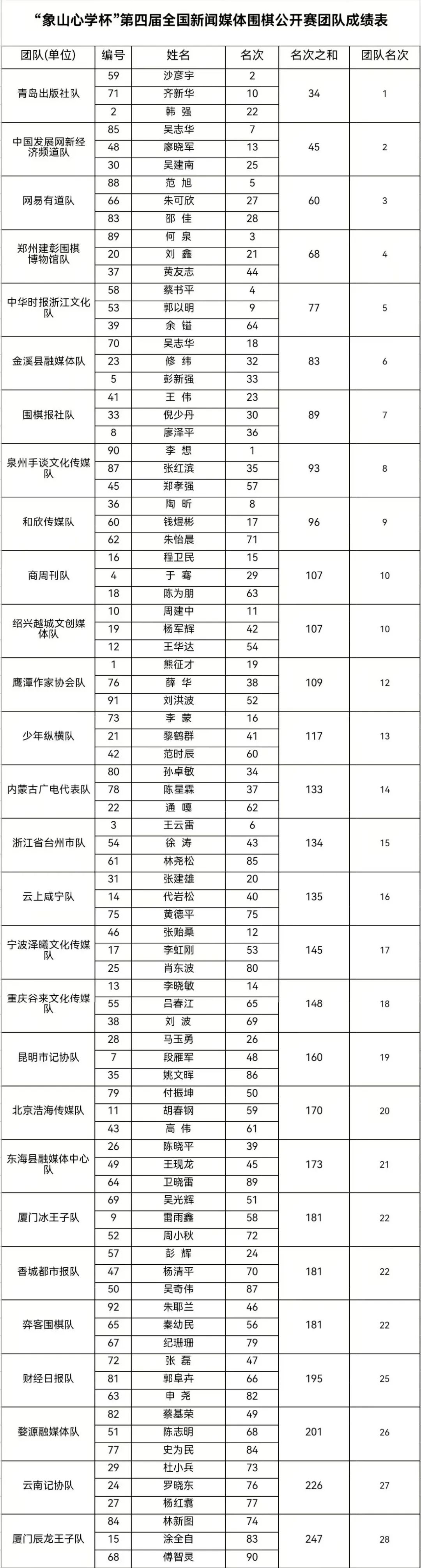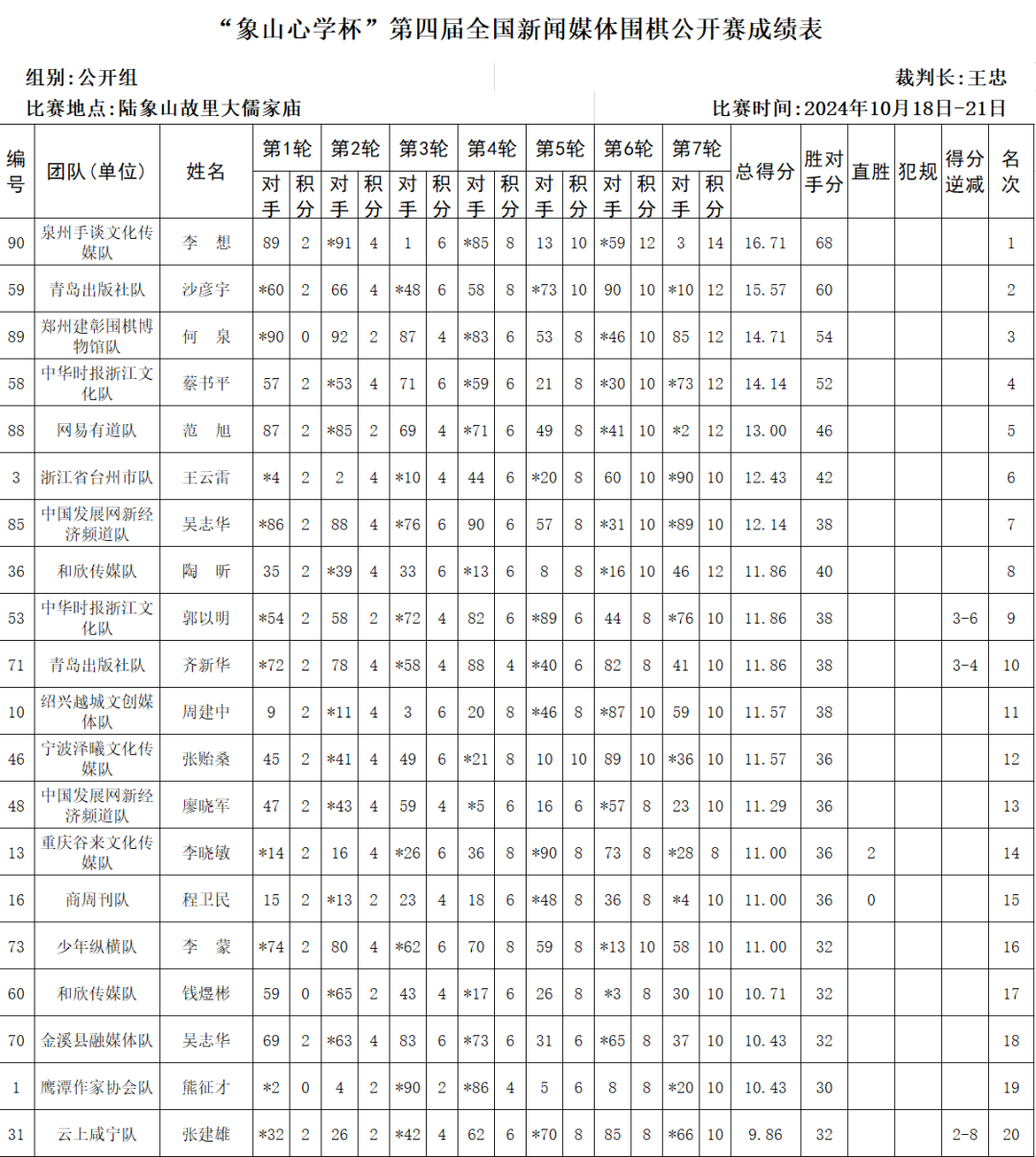 10月20日,“象山·心学杯”第四届全国新闻媒体围棋公开赛在江西省抚州市金溪县闭幕。李想、沙彦宇、何泉获得个人前三名,青岛出版社队、中国发展网新经济频道队、网易有道队获得团体前三名。
