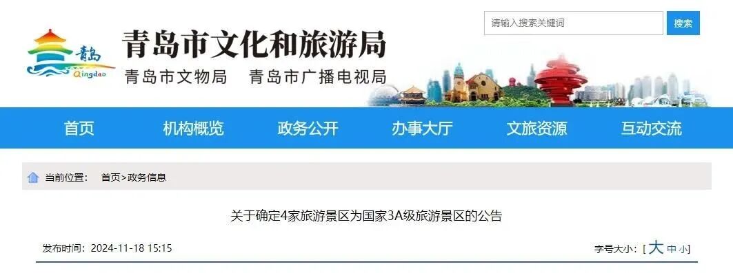 近日,青岛市文化和旅游局官网发布关于确定4家旅游景区为国家3A级旅游景区的公告。