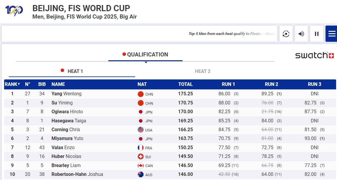 这是苏翊鸣继2022北京冬奥会和上赛季世界杯两次夺冠后第三次在“雪飞天”亮相。本站比赛共有53名选手参加男子单板大跳台资格赛,选手们共分为两组,每组前五名晋级决赛。苏翊鸣在第一次试跳便获得88.00的高分,在第一跳后位列小组第二名,在第二跳跳出76.00分的成绩之后,他在第三跳得到82.75分,最终以170.75分的总分排名第二晋级决赛。杨文龙则在前两跳中分别获得86.00和89.25的高分,以175.25分排名小组首位强势晋级。