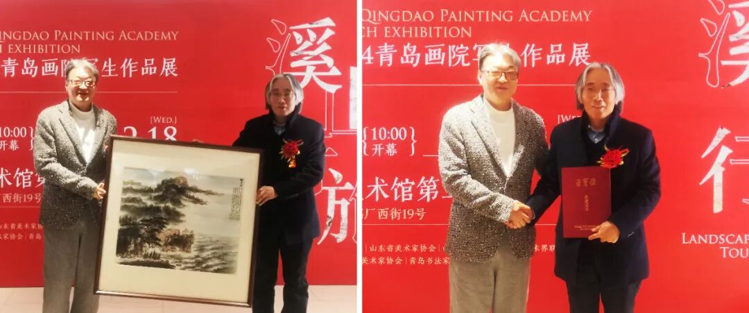 荣宝斋有限公司常务副总经理、党委副书记范存刚、青岛文联副主席、青岛市美术家协会主席、青岛画院名誉院长张风塘,分别代表荣宝斋、青岛画院捐赠画作和回赠证书。