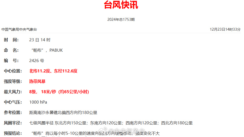 据中央气象台消息,今天(23日)14时,南海热带低压加强为今年第26号台风“帕布”(热带风暴级,英文名称:Pabuk;名字来源:老挝;名字意义:一种湄公河中的大型淡水鱼)。