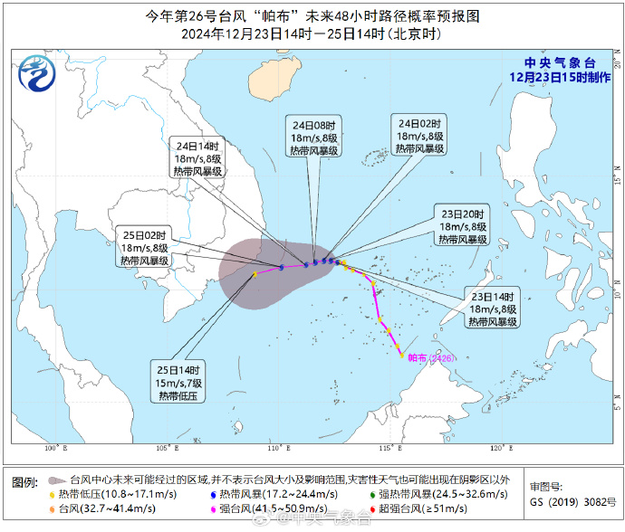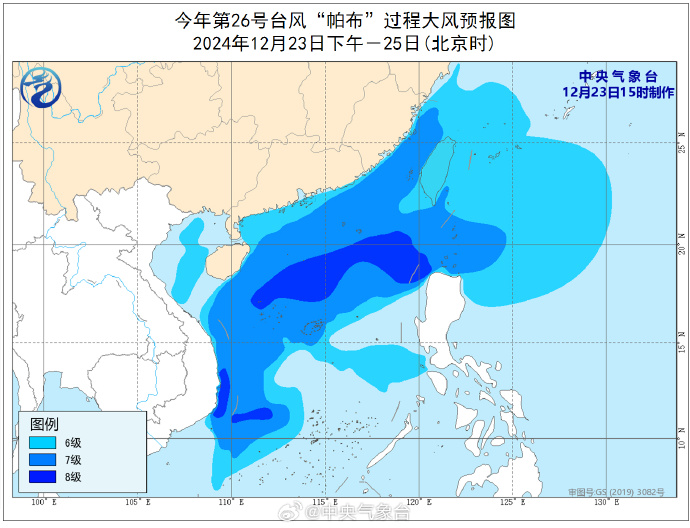 【大风】23日下午至25日,受冷空气和台风“帕布”的共同影响,福建沿海、广东沿海、海南岛沿海、台湾岛沿海、东海南部、台湾以东洋面、台湾海峡、南海大部、巴士海峡、北部湾有6~7级大风,阵风8~9级,南海北部和西南部的部分海域以及西沙群岛附近海域风力有8级,阵风9~10级。