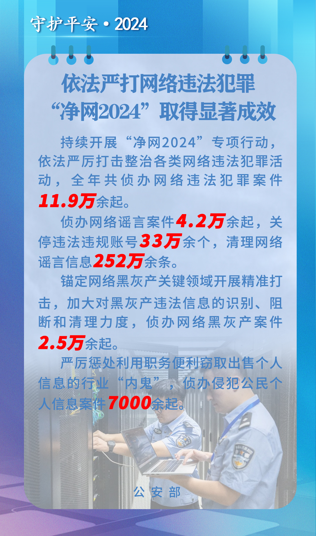 记者今天从公安部获悉,2024年,全国公安机关持续开展“净网2024”专项行动,依法严厉打击整治各类网络违法犯罪活动,全年共侦办网络违法犯罪案件11.9万余起。