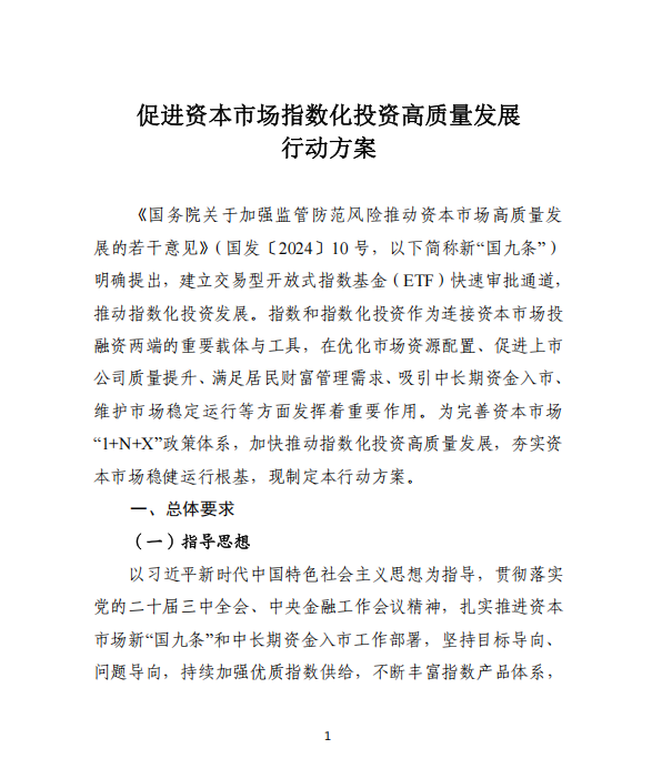 《行动方案》以习近平新时代中国特色社会主义思想为指导,贯彻落实党的二十届三中全会、中央金融工作会议精神,扎实推进资本市场新“国九条”和中长期资金入市工作部署,坚持目标导向、问题导向,持续加强优质指数供给,不断丰富指数产品体系,加快优化指数化投资生态,强化全链条监管和风险防范安排,着力推动资本市场指数与指数化投资高质量发展。