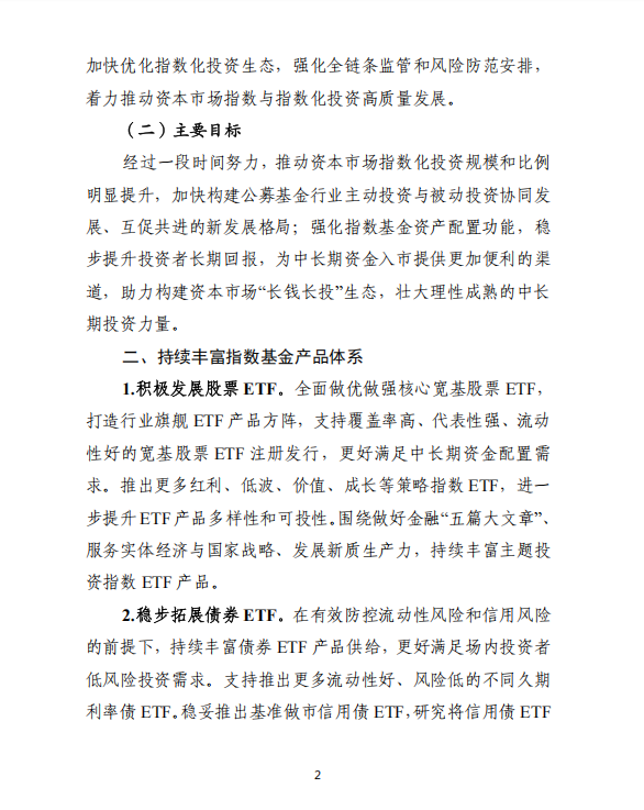 《行动方案》的主要目标是,推动资本市场指数化投资规模和比例明显提升,加快构建公募基金行业主动投资与被动投资协同发展、互促共进的新发展格局;强化指数基金资产配置功能,稳步提升投资者长期回报,为中长期资金入市提供更加便利的渠道,助力构建资本市场“长钱长投”生态,壮大理性成熟的中长期投资力量。