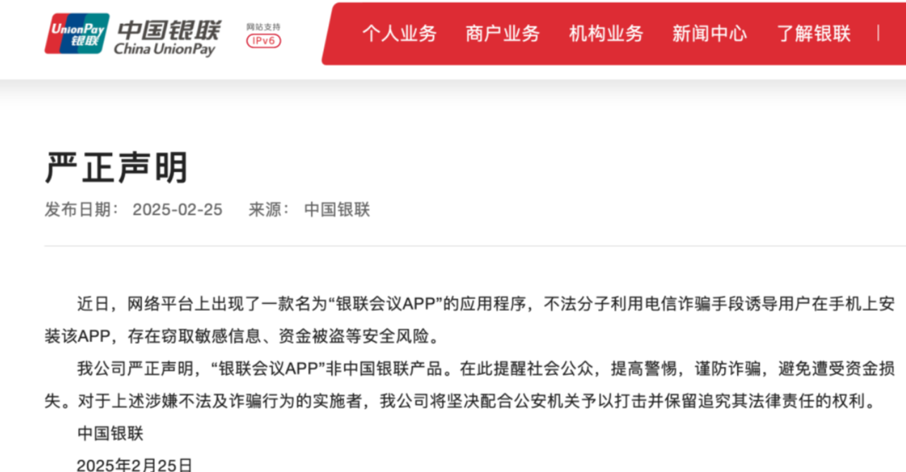 中国银联严正声明,“银联会议APP”非中国银联产品。在此提醒社会公众,提高警惕,谨防诈骗,避免遭受资金损失。对于上述涉嫌不法及诈骗行为的实施者,我公司将坚决配合公安机关予以打击并保留追究其法律责任的权利。