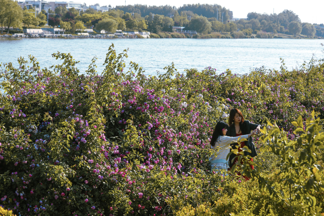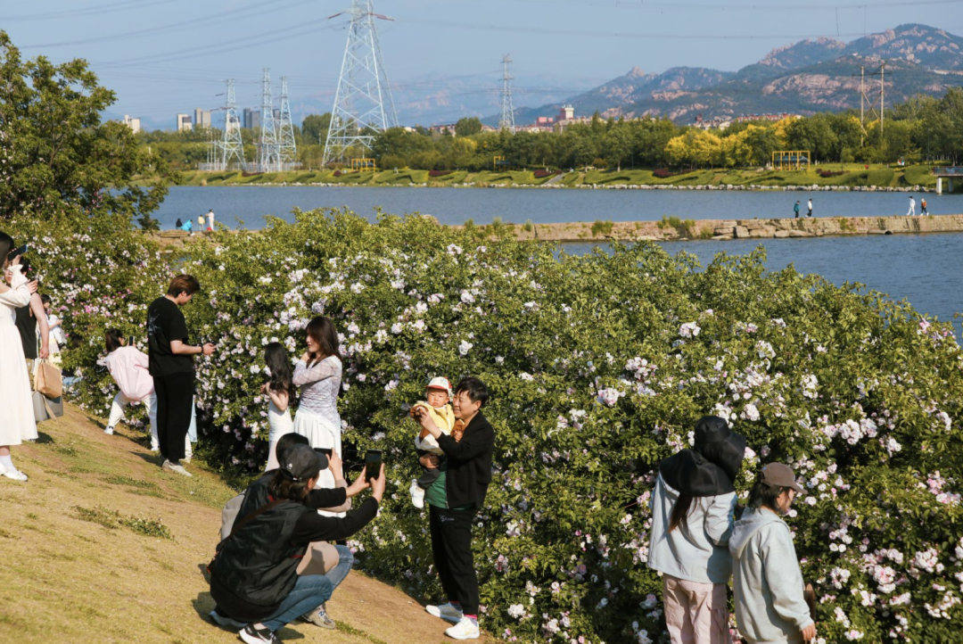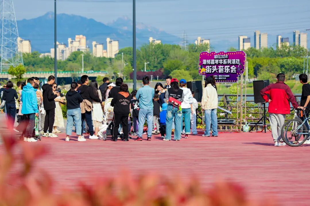 蔷薇花海邂逅街头艺术,音乐赋能城市烟火。赛后,市民游客移步至白沙河亲水平台,步入绵延数百米的蔷薇花海。粉白花瓣随风摇曳,与河岸景观共同构成一幅生态画卷。与此同时,街角乐队以河畔花海为背景,献上流行音乐现场表演。演出摒弃传统舞台形式,将《情非得已》《奔跑》等经典曲目融入市井街巷,市民驻足聆听、拍照打卡,在花香与旋律交织中感受艺术与生活的无缝衔接。
